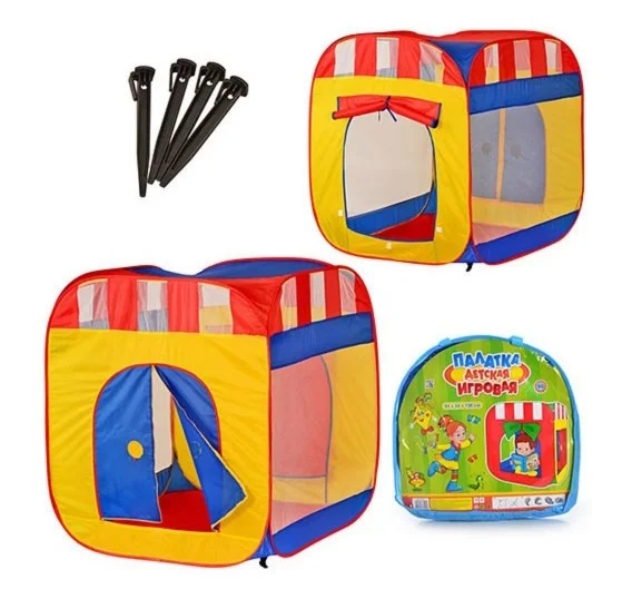 Один вход закрывается на молнию и выполнен в виде дверей, второй вход распашной. Две боковые стены выполнены из сетчатого материала. В комплект входят 4 колышка,благодаря которым детскую игровую палатку можно использовать на открытом воздухе.Размер в собранном состоянии 94х94х106 см. -