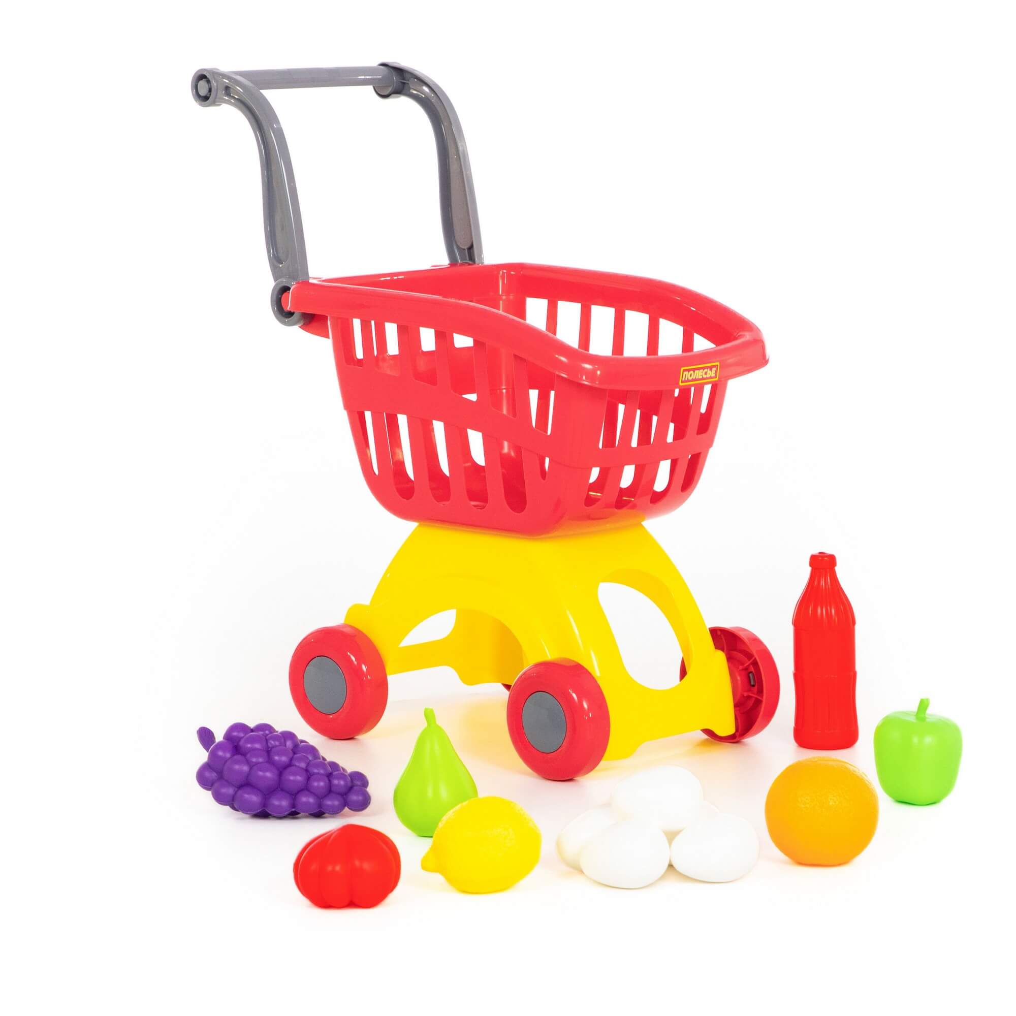 В комплект игрушечной тележки входит набор продуктов для детей: