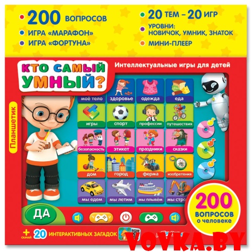 Этот говорящий планшетик – прекрасный подарок для маленьких эрудитов! 200 умных вопросов, 20 игровых тем, 3 уровня – играй и узнавай много интересного! Выбирай одну из увлекательных викторин – «Марафон» или «Фортуна». Отвечай на вопросы с весёлым Максом и становись Суперзнатоком!