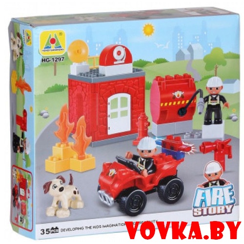 Из деталей конструктора HG-1297 собирается игрушечная заправочная станция, красный автомобиль и конструкция с пламенем. Для того, чтобы потушить огонь в наборе есть игрушечный огнетушитель, два человечка и собака.