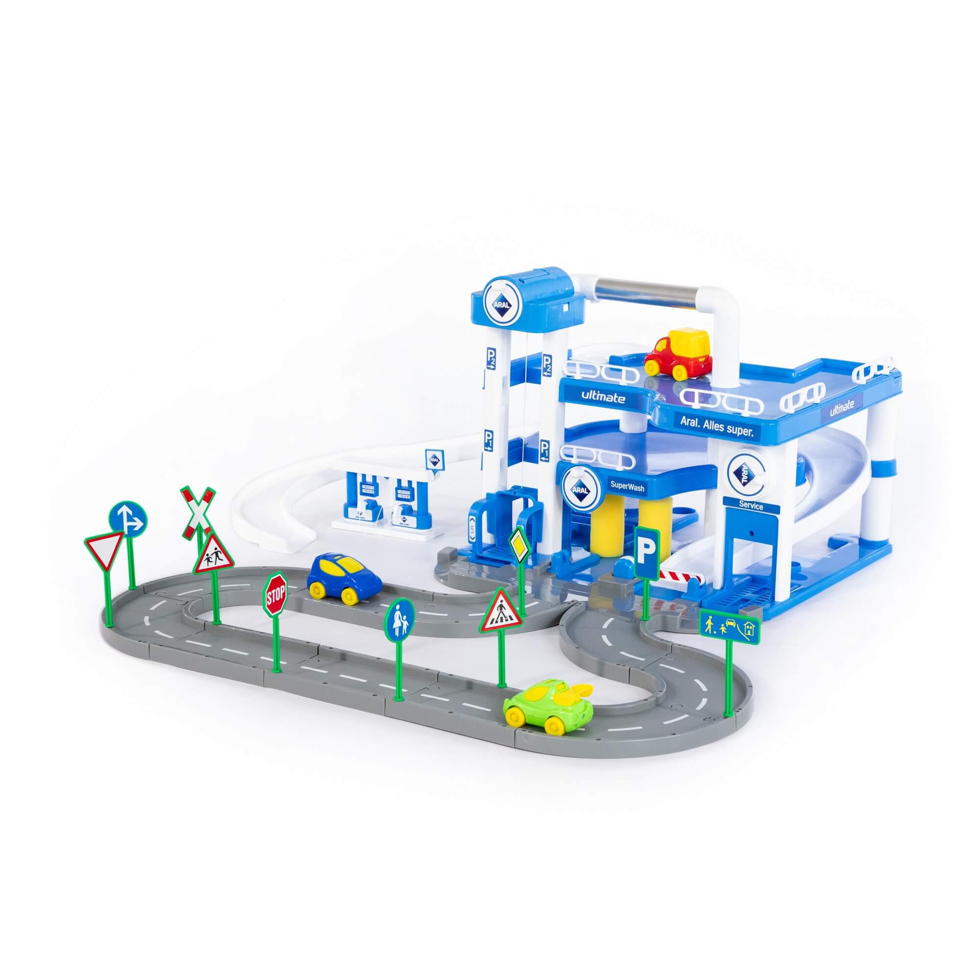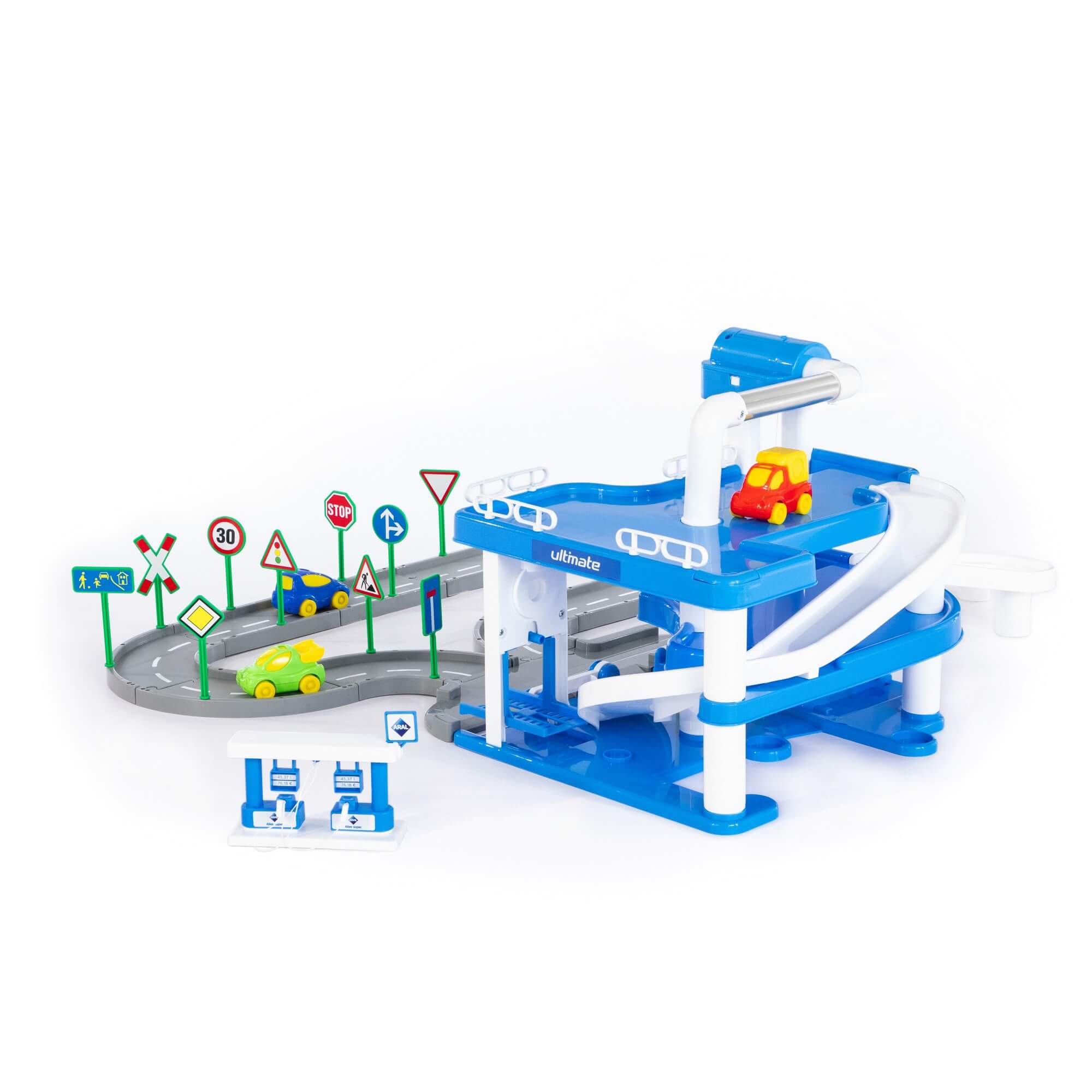 3-уровневый паркинг "ARAL" с дорогой wader от фабрики "Полесье" - это аналог гаража №1 с дорогой (в коробке) (арт. 37831). Гараж представляет собой трехуровневую парковку для входящих в набор автомобилей (3 шт.).