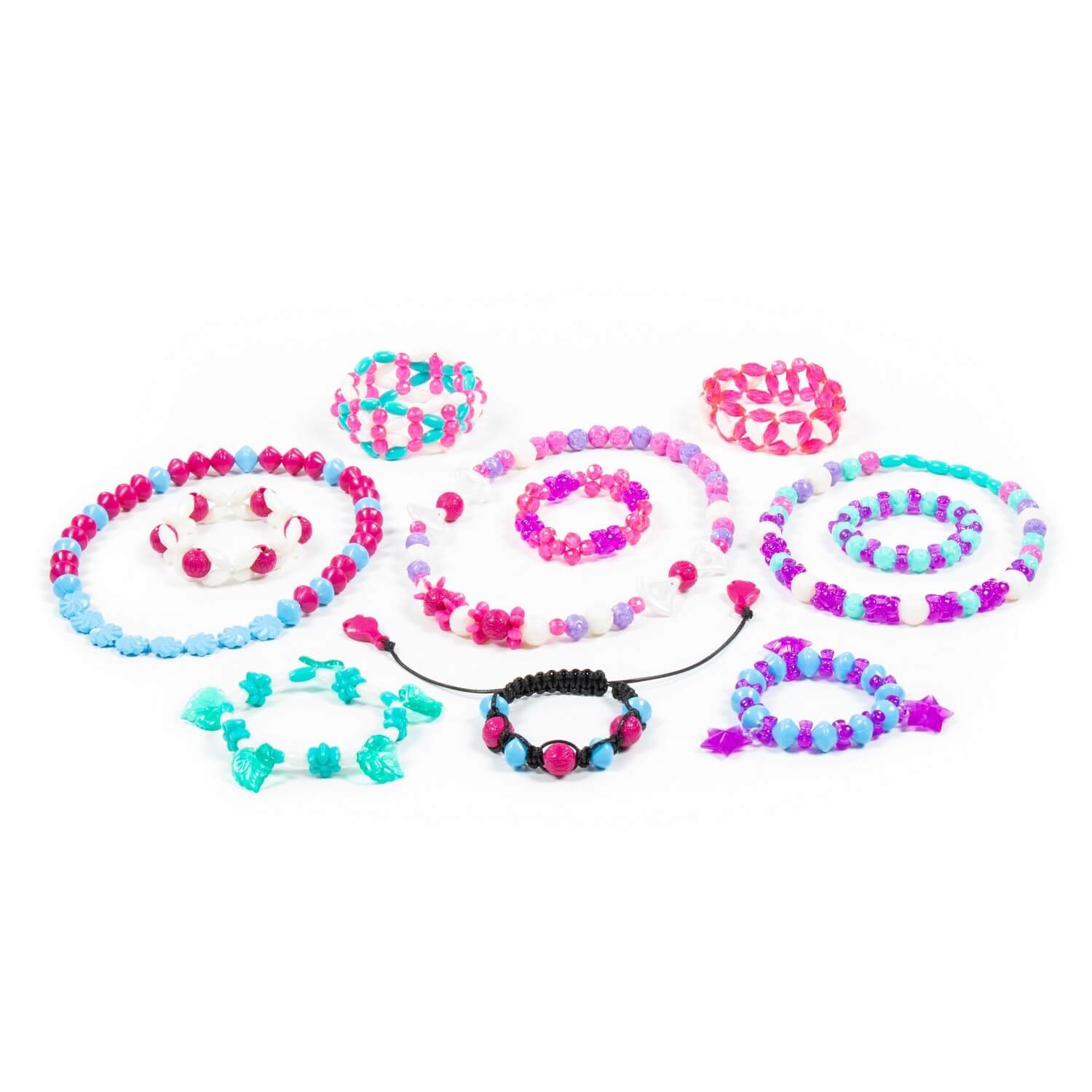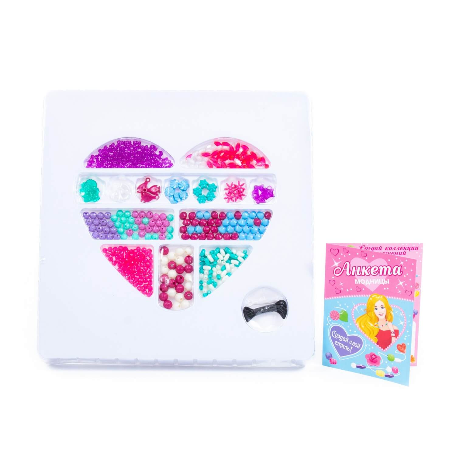 В комплект входит более 400 бусинок, шнурок и резиночка для украшений. Все бусины имеют разную форму и цвет, выполнены из качественного пластика. Разнообразит игру и сделает её ещё интереснее анкета модницы, которая также входит в комплект. Такой набор для плетения позволяет фантазировать, творить, создавать своими руками разнообразные браслеты, фенечки и играть.