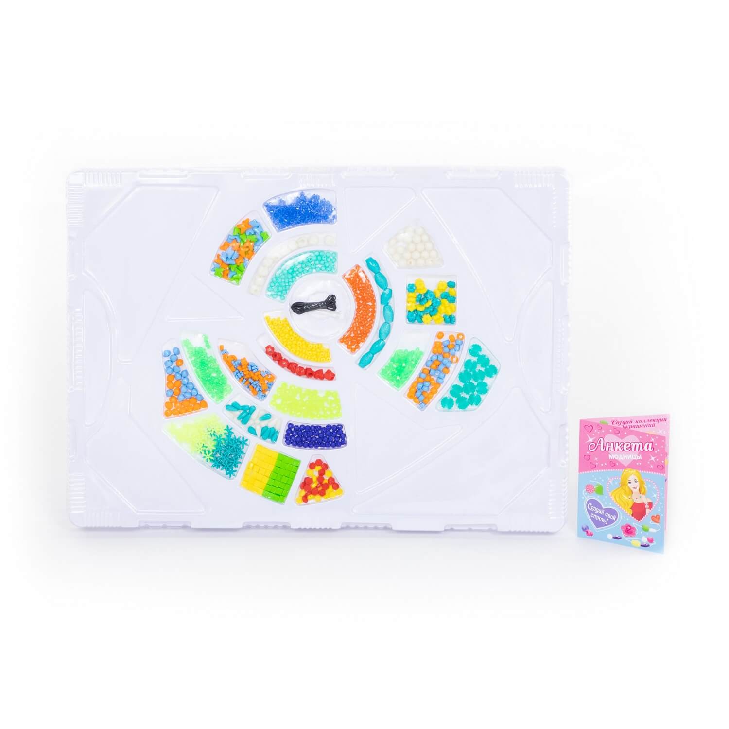 В комплект входит более 1000 бусинок, шнурок и резиночка для украшений. Все бусины имеют разную форму и цвет, выполнены из качественного пластика. Разнообразит игру и сделает её ещё интереснее анкета модницы, которая также входит в комплект. Такой набор для плетения позволяет фантазировать, творить, создавать своими руками разнообразные браслеты, фенечки и играть.