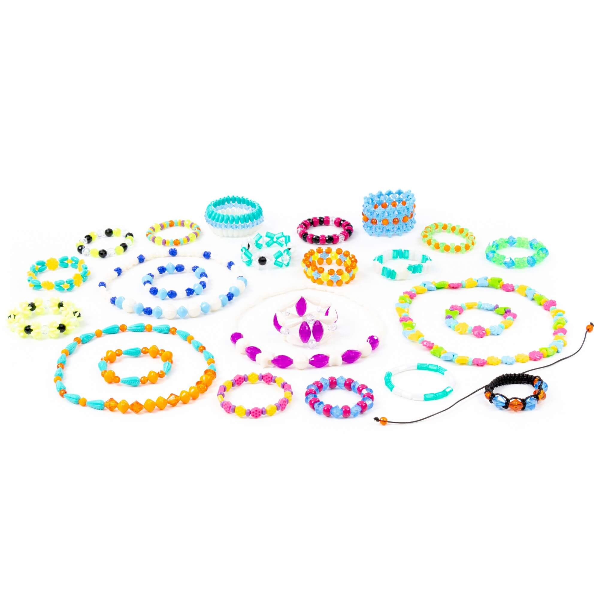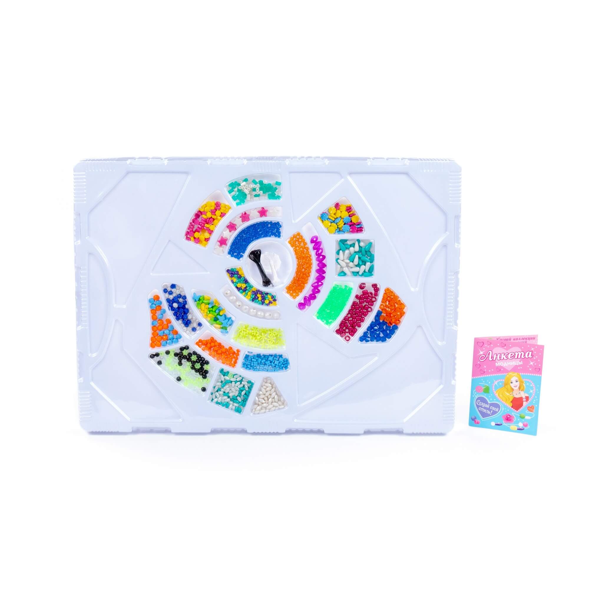 В комплект входит более 1000 бусинок, шнурок и резиночка для украшений. Все бусины имеют разную форму и цвет, выполнены из качественного пластика. Разнообразит игру и сделает её ещё интереснее анкета модницы, которая также входит в комплект. Такой набор для плетения позволяет фантазировать, творить, создавать своими руками разнообразные браслеты, фенечки и играть.