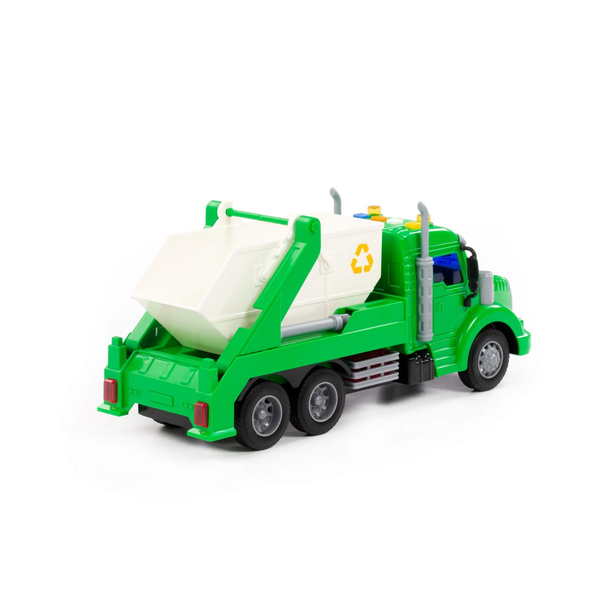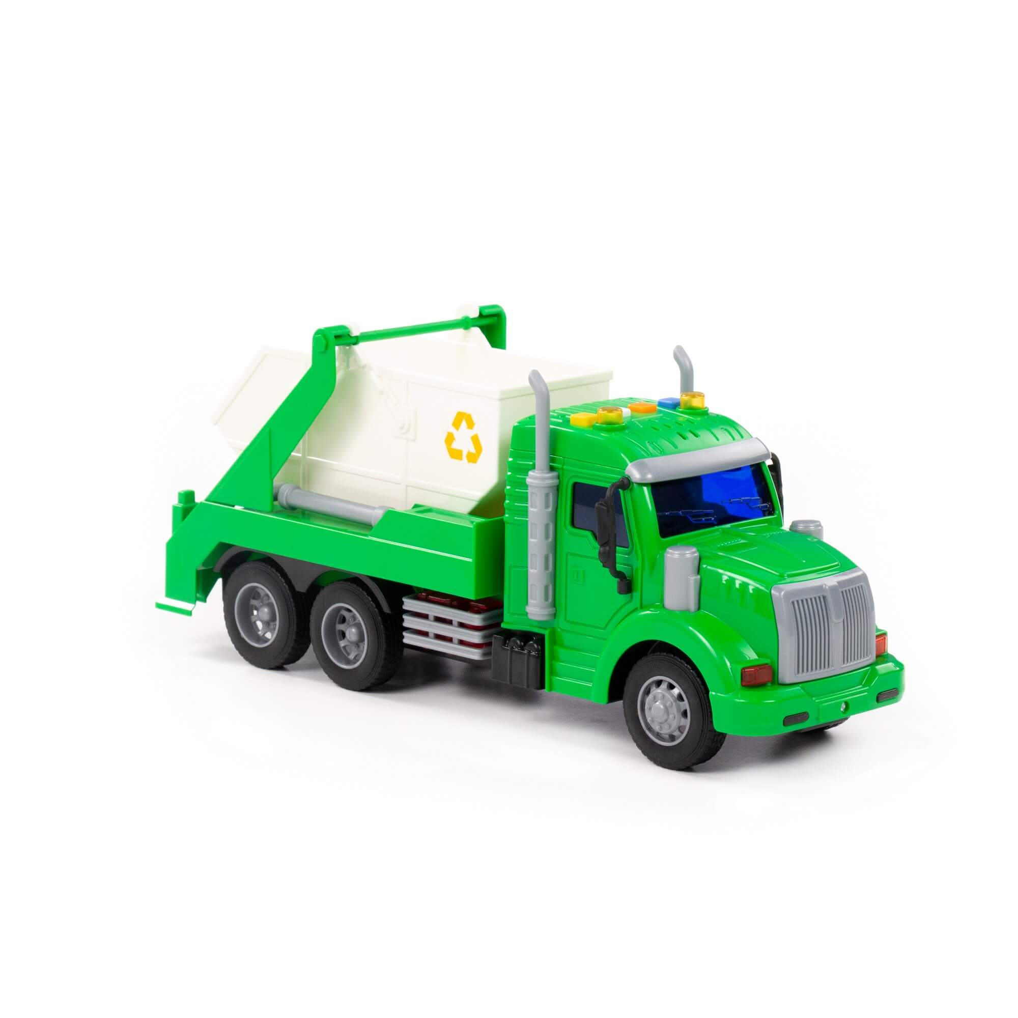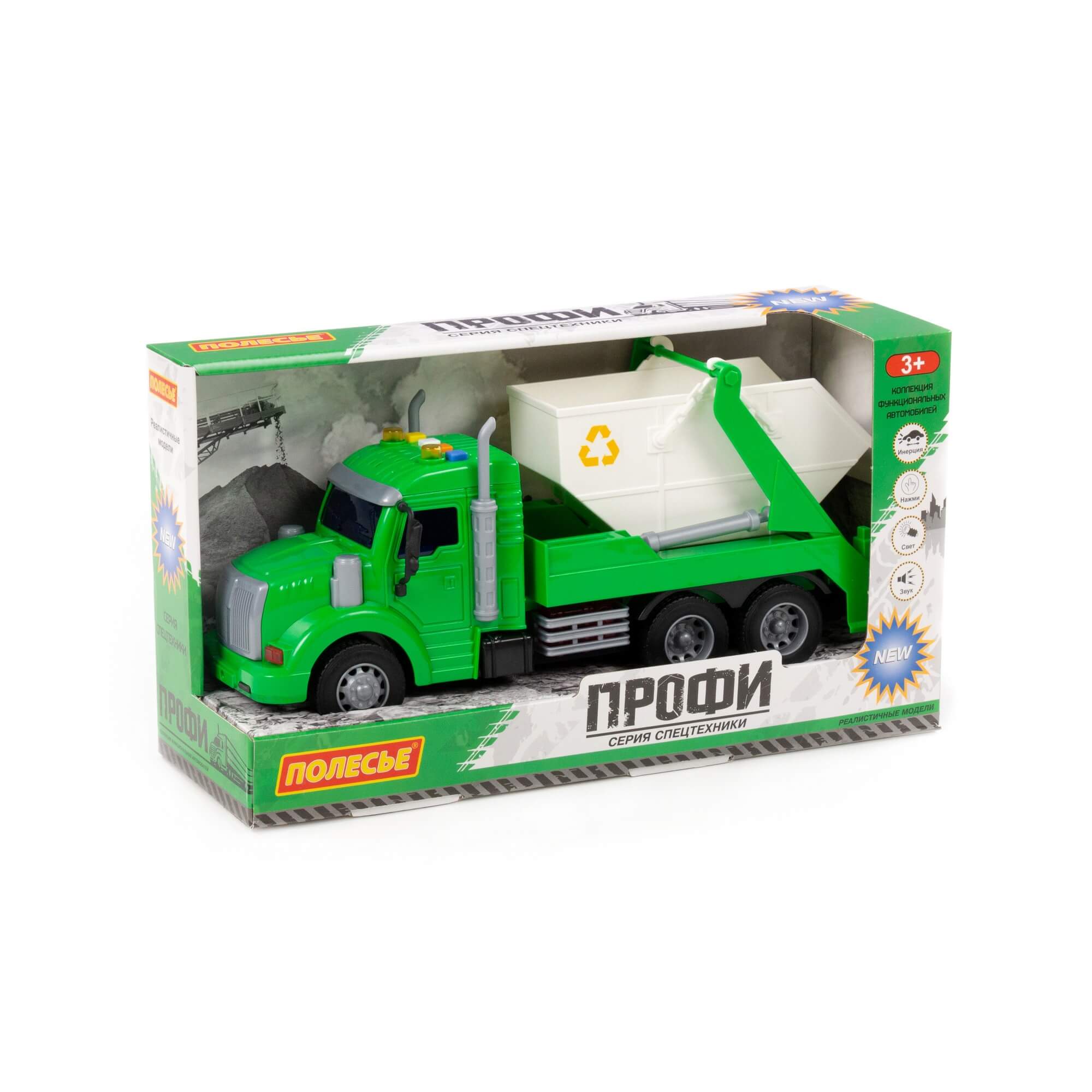 Детский игрушечный автомобиль-контейнеровоз инерционный «Профи» от фабрики «Полесье» - это качественная реалистичная игрушка машинка для мальчиков, конструкция которой полностью повторяет дизайн настоящей техники. Спецмашина для детей имеет три пары колёс на железных осях, кроме того, она оснащена съёмным контейнером, который позволит придумывать различные сценарии игры. На кабине авто имеется 4 кнопки управления звуковыми и световыми эффектами.