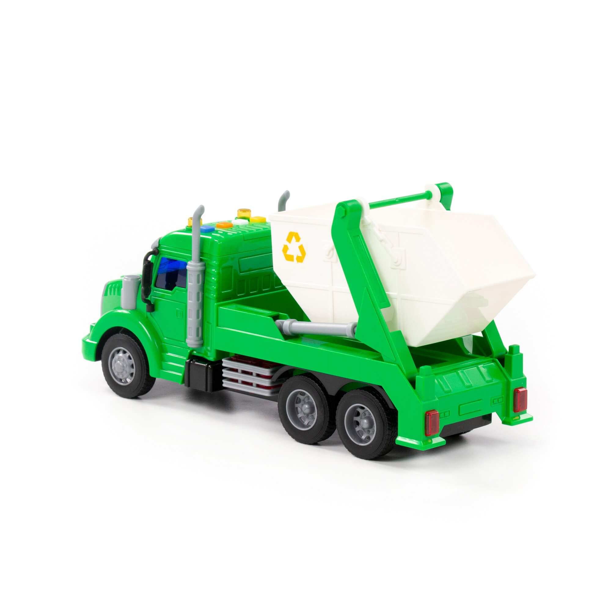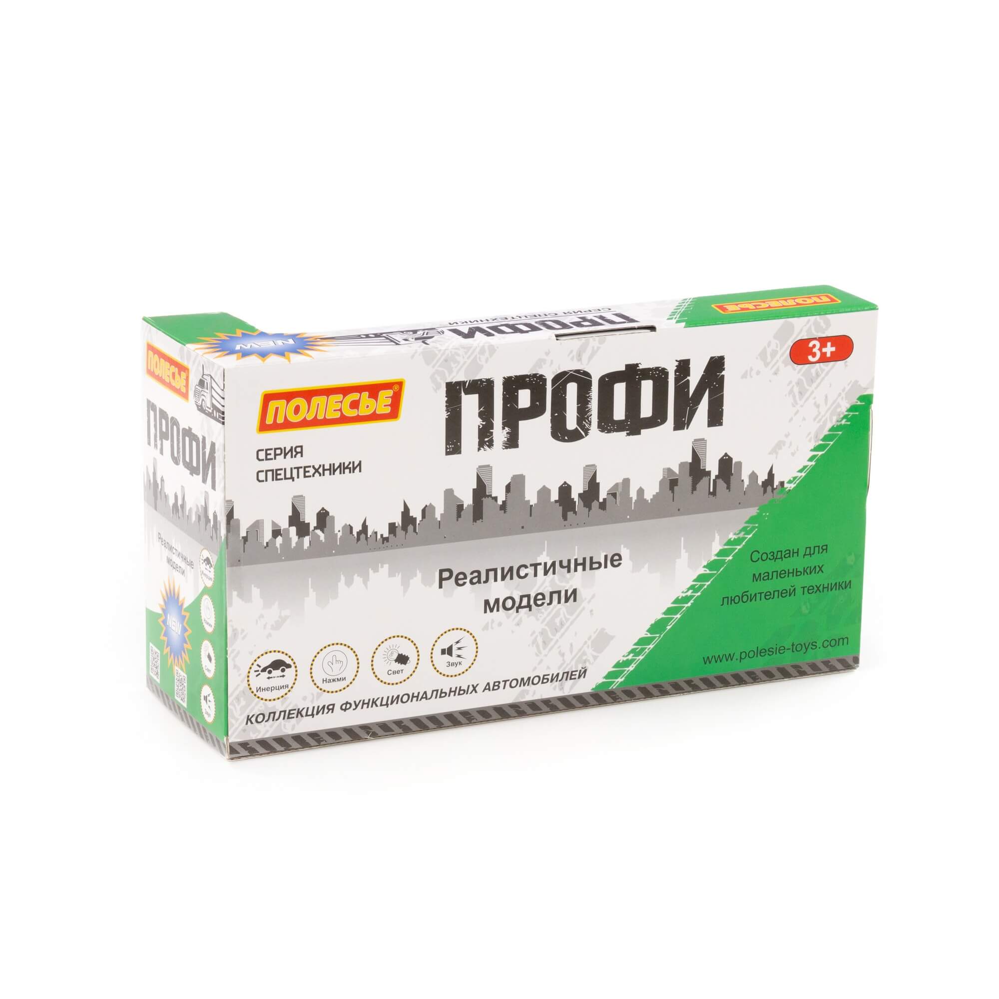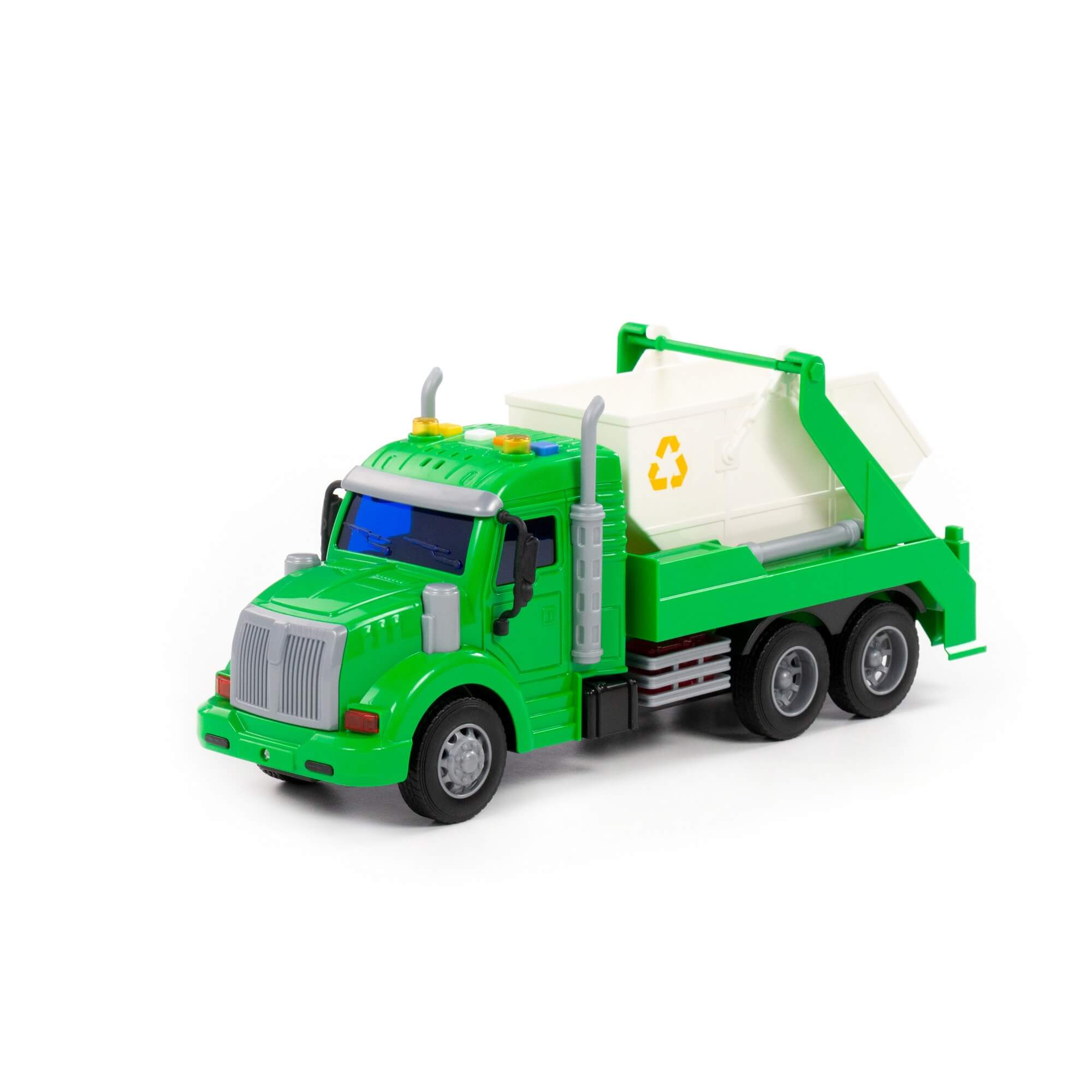 Детский игрушечный автомобиль-контейнеровоз инерционный «Профи» от фабрики «Полесье» - это качественная реалистичная игрушка машинка для мальчиков, конструкция которой полностью повторяет дизайн настоящей техники. Спецмашина для детей имеет три пары колёс на железных осях, кроме того, она оснащена съёмным контейнером, который позволит придумывать различные сценарии игры. На кабине авто имеется 4 кнопки управления звуковыми и световыми эффектами.