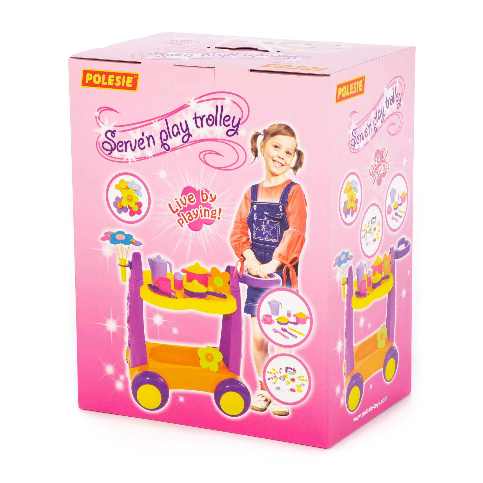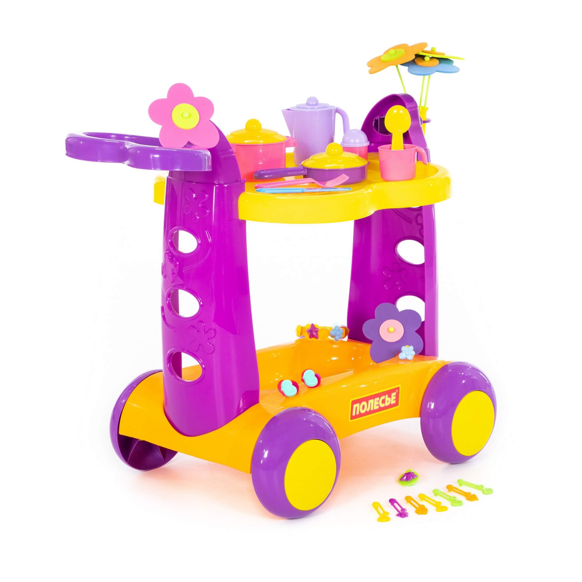 Игрушечный сервировочный столик для девочек от фабрики Полесье представляет собой детскую тележку на колесиках.
