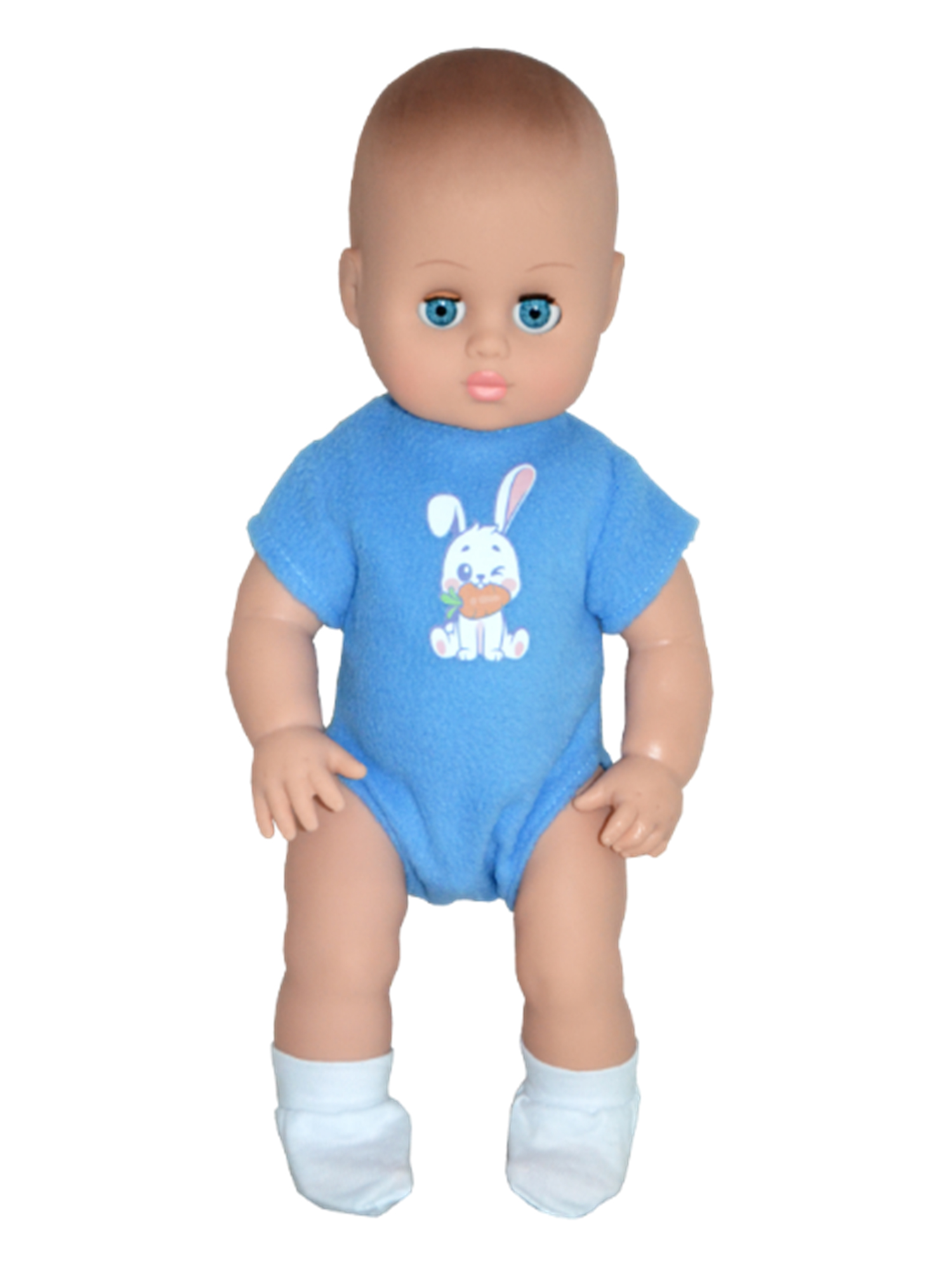 Малыш Гена изготовлен из пластиката ПВХ. Глаза вставные закрывающиеся. Одежда съемная, в комплекте: комбинезон, носочки. Парик рельефный.