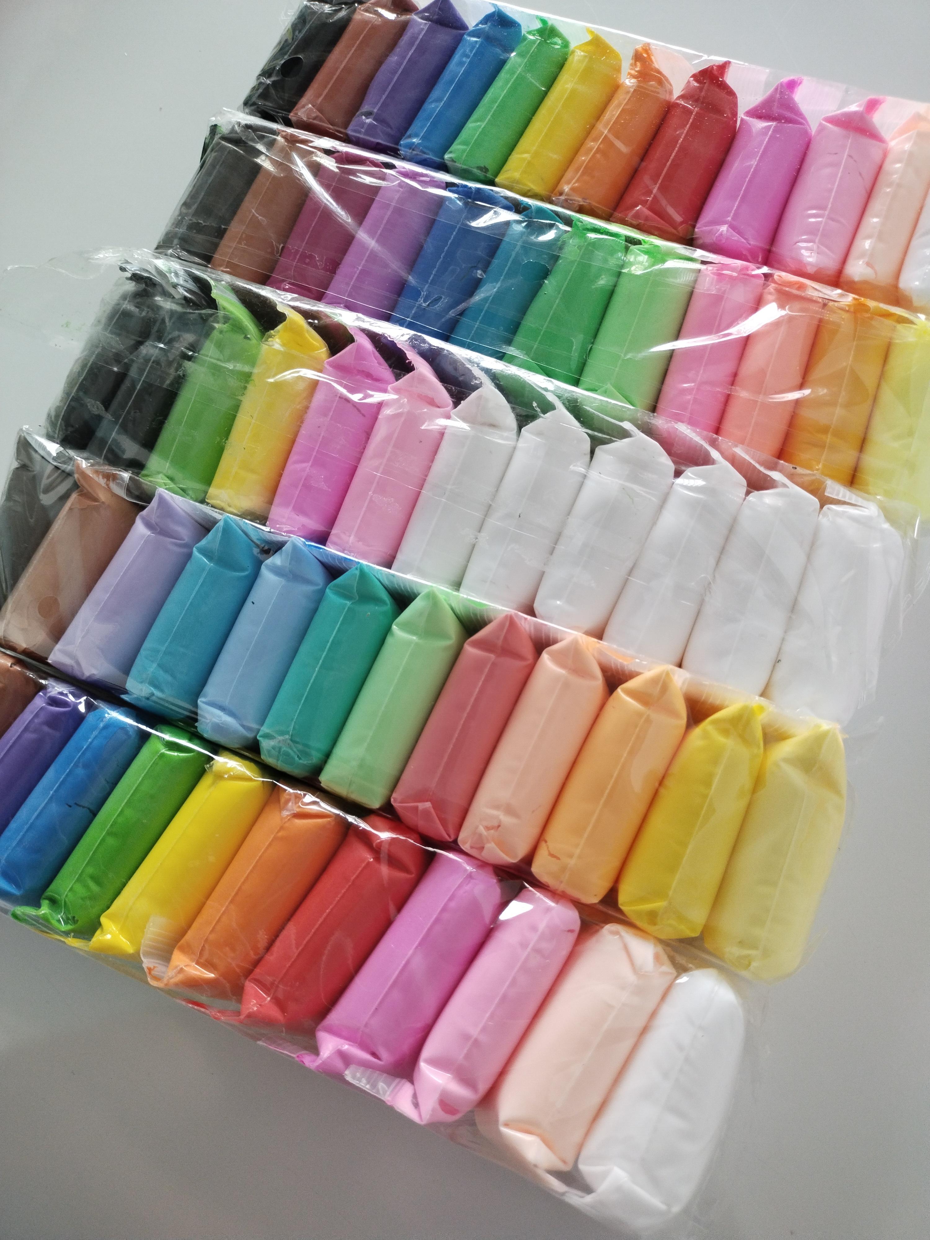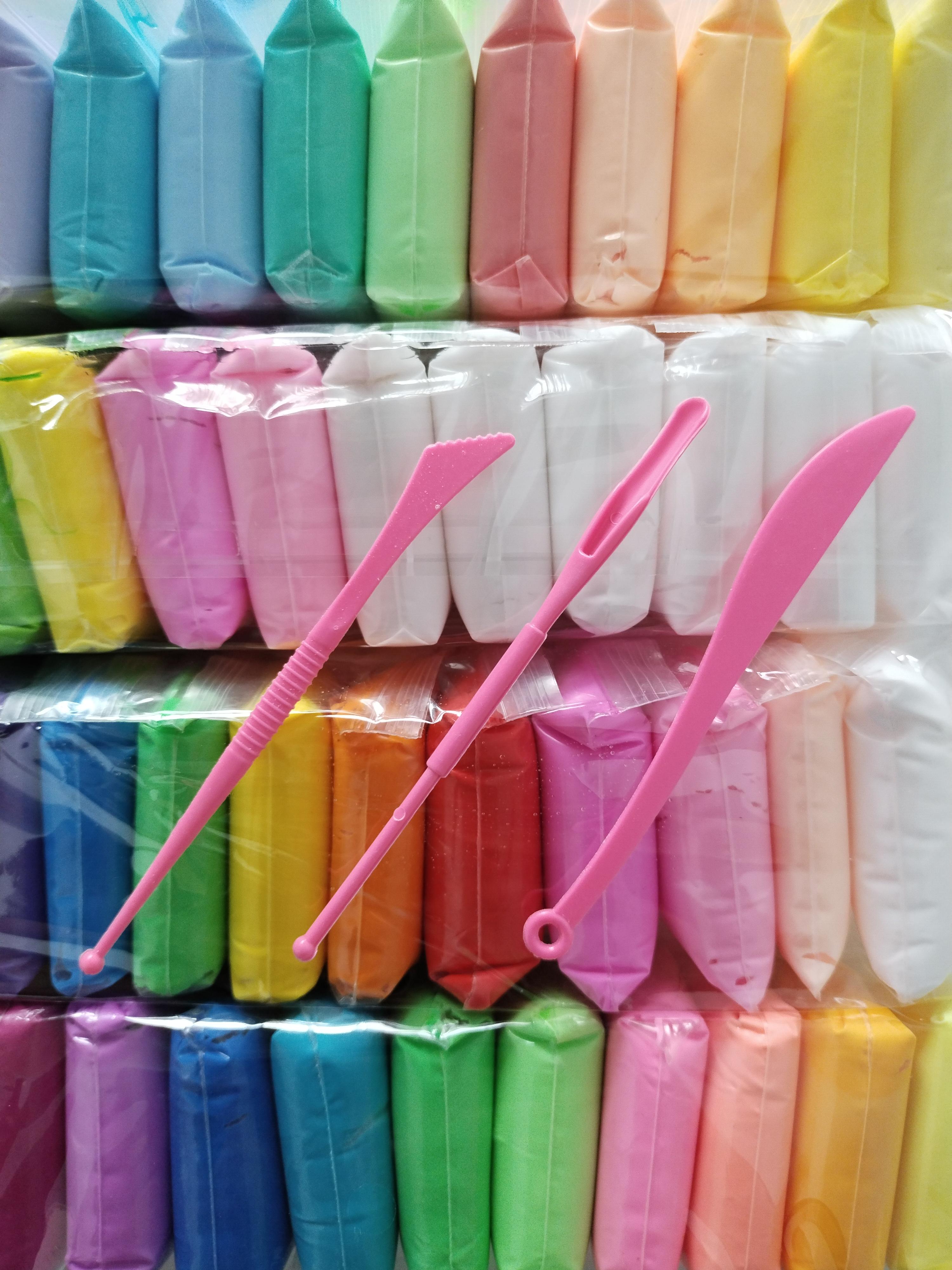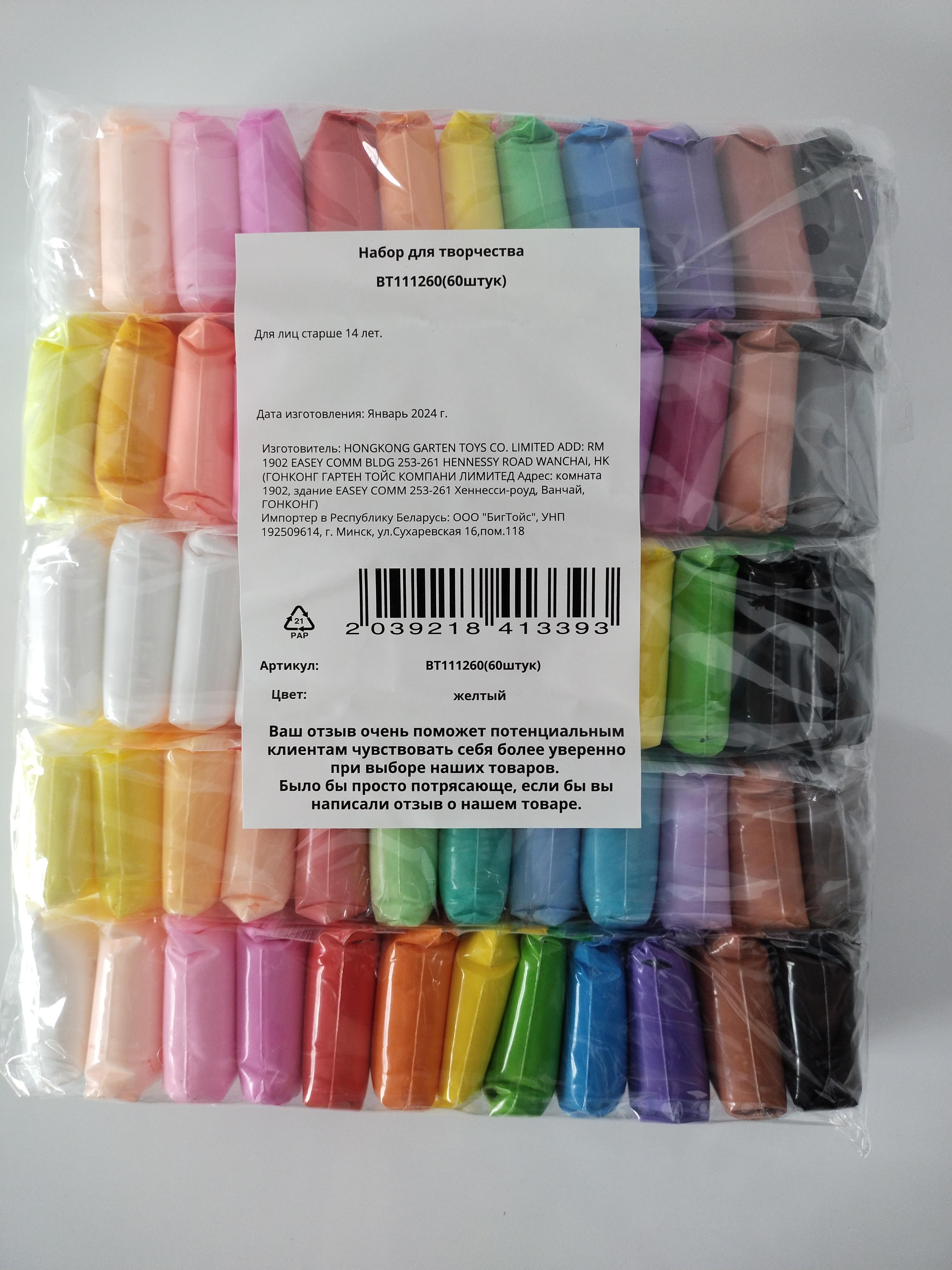 В наборе 60 пакетиков пластилина разных цветов и лопаточки для формовки. Разные цвета можно смешивать между собой, в результате чего получится совершенно другой цвет. Тесто находится в пластиковом пакете, в закрытом состоянии оно сохраняется мягким, пластичным и хорошо разминающимся.
