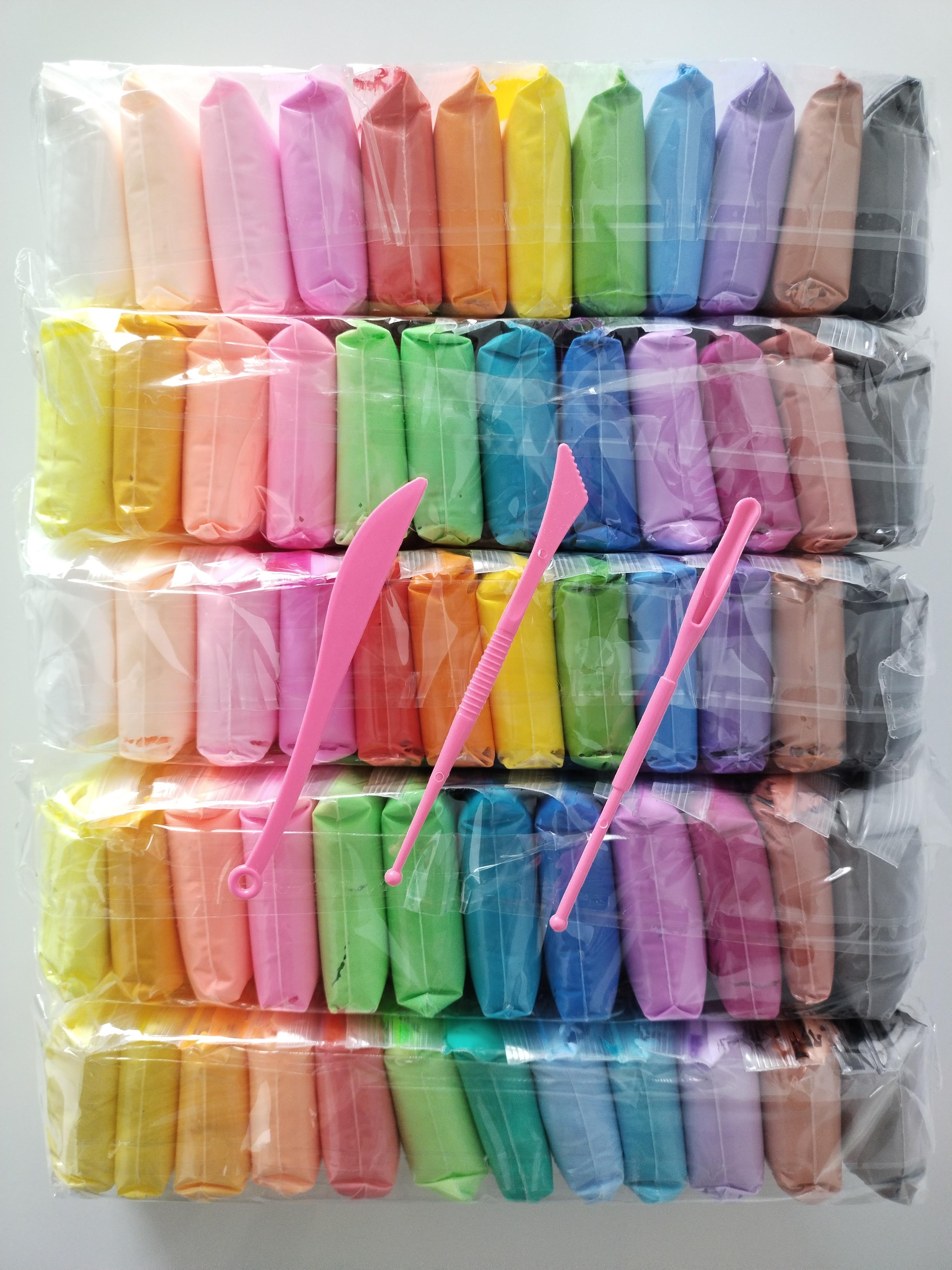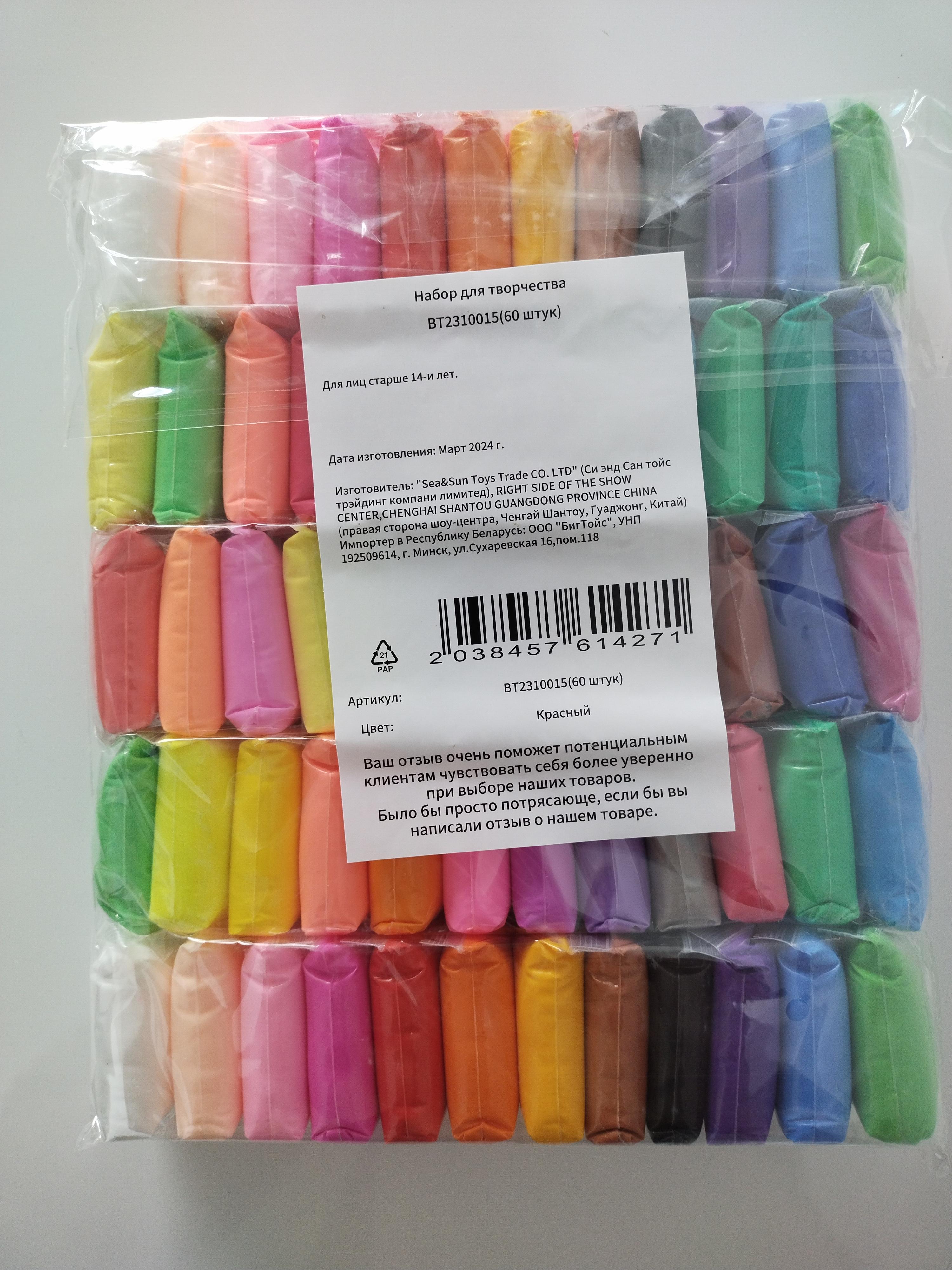 В наборе 60 пакетиков пластилина разных цветов и лопаточки для формовки. Разные цвета можно смешивать между собой, в результате чего получится совершенно другой цвет. Тесто находится в пластиковом пакете, в закрытом состоянии оно сохраняется мягким, пластичным и хорошо разминающимся.