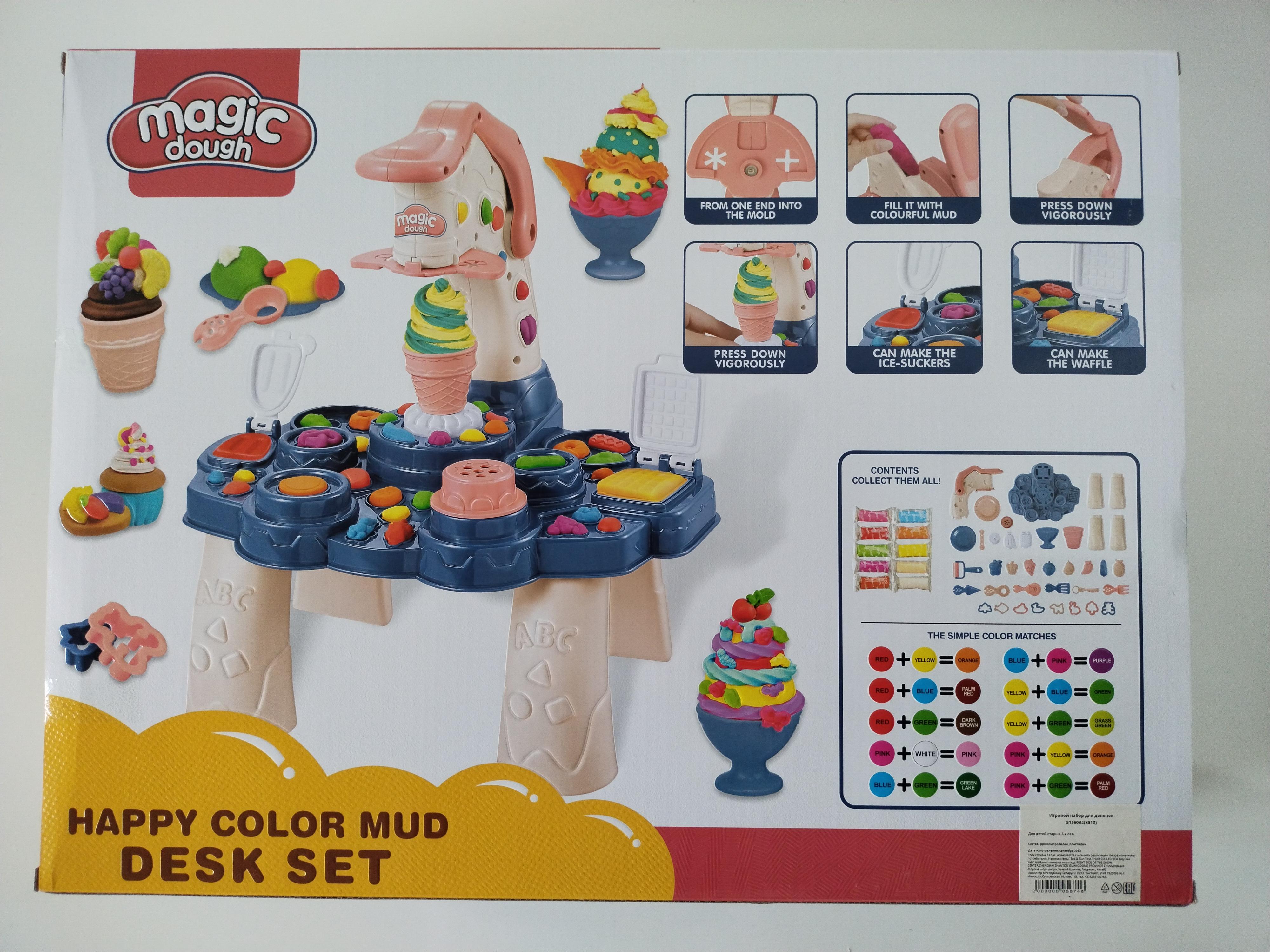 Набор для детского творчества Magic Dough состоит гипоаллергенного пластилина, пресса с разными формами для создания пирожных, мороженого и вафель.