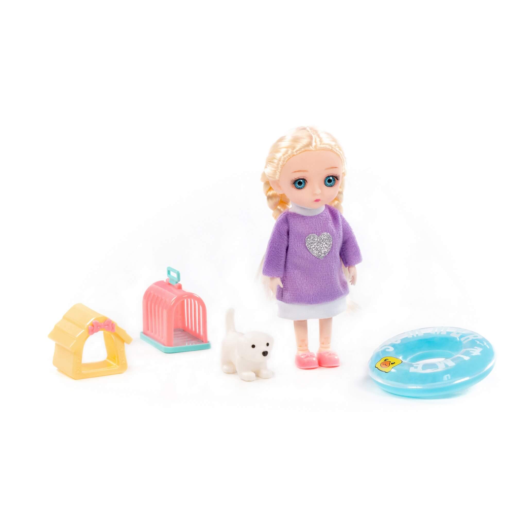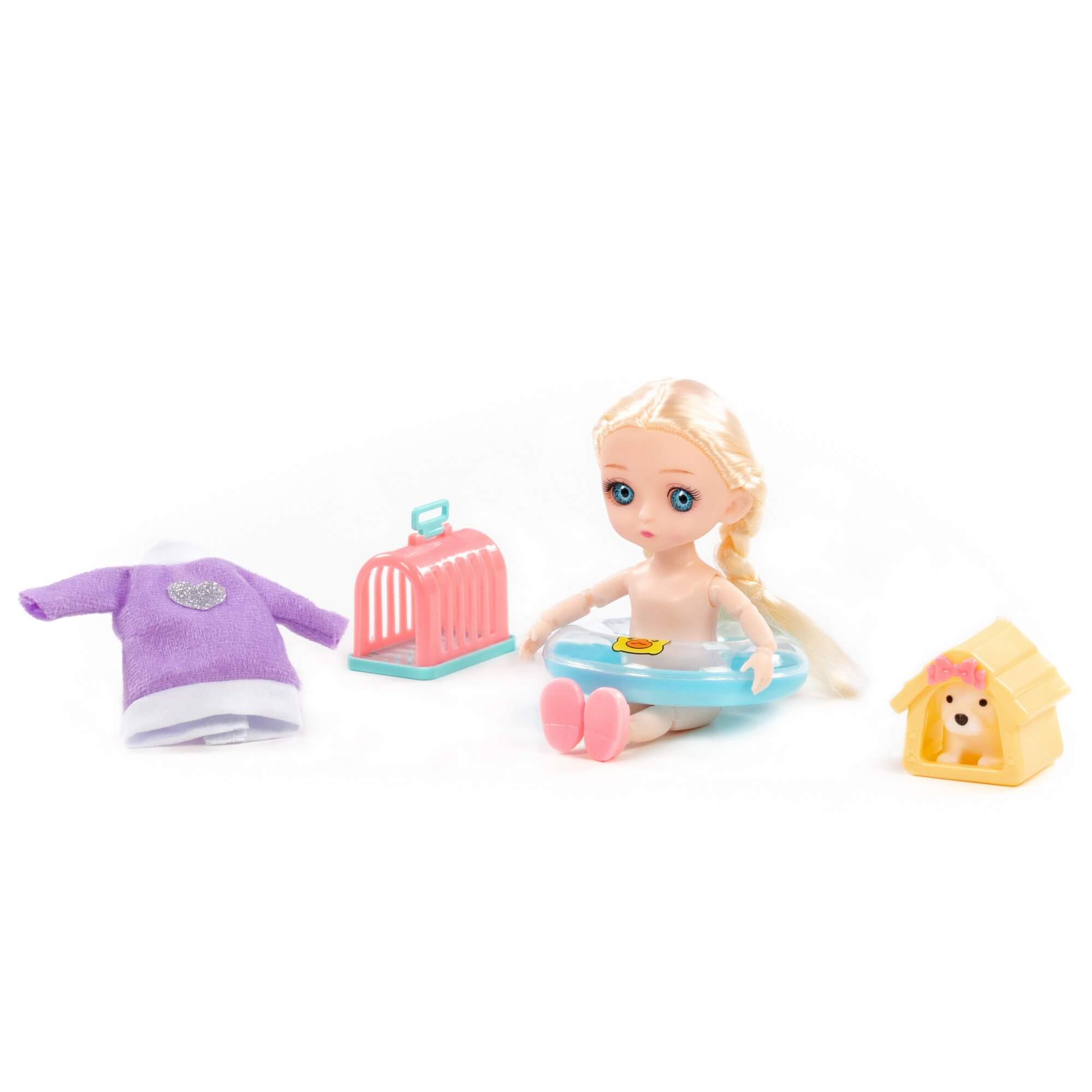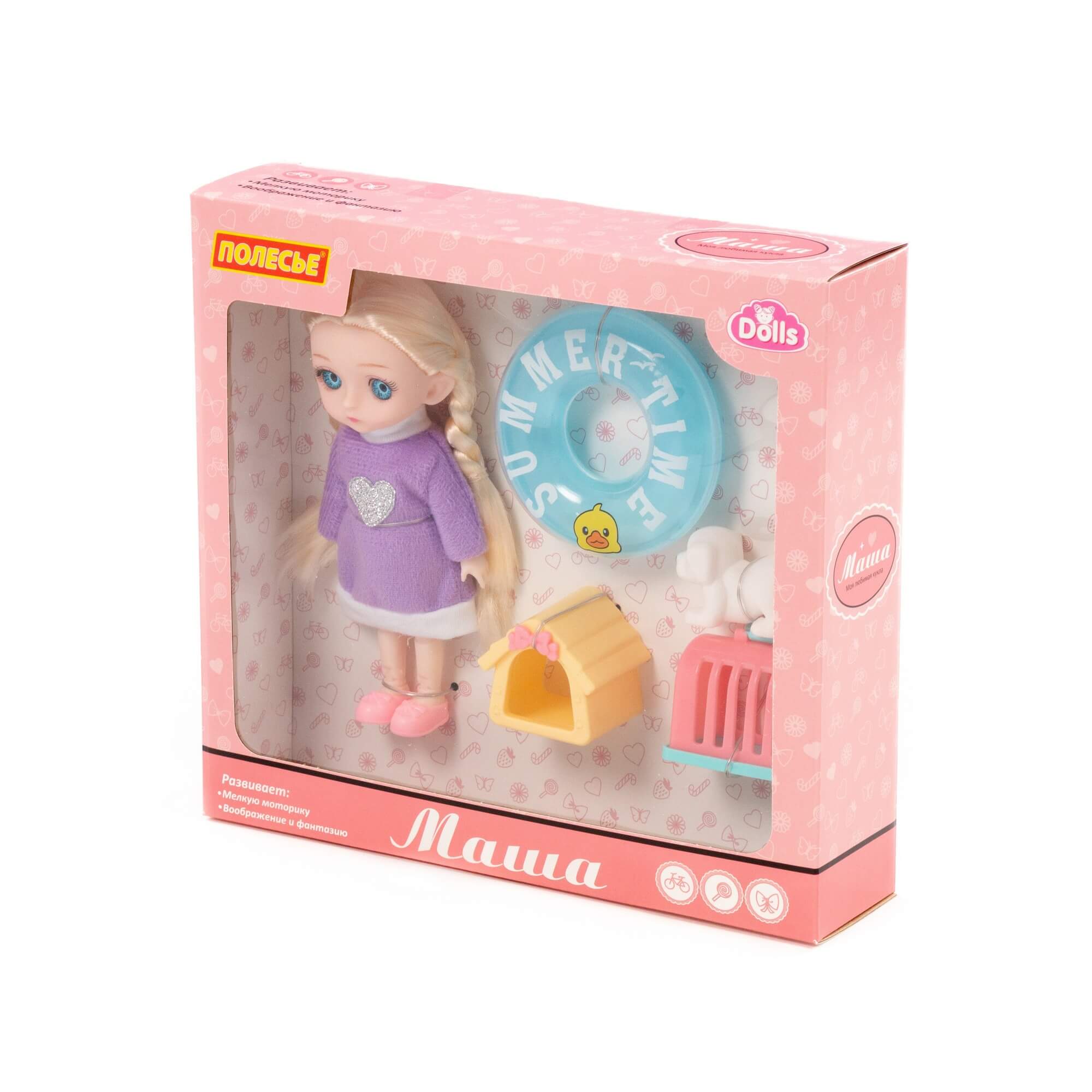 В наборе с куклой идут игрушечный спасательный круг для безопасного купания, милый песик с уютным домиком и переноской для комфортного перемещения питомца. Благодаря наличию тематических аксессуаров для кукол ребенок может придумать множество необычных и интересных сценариев игры.