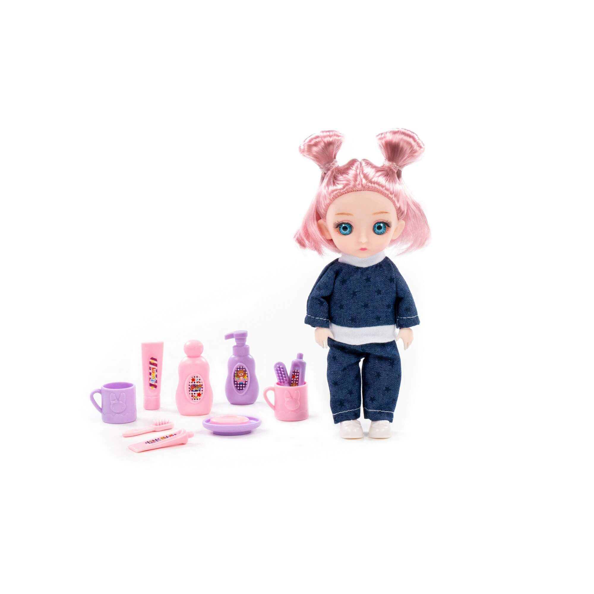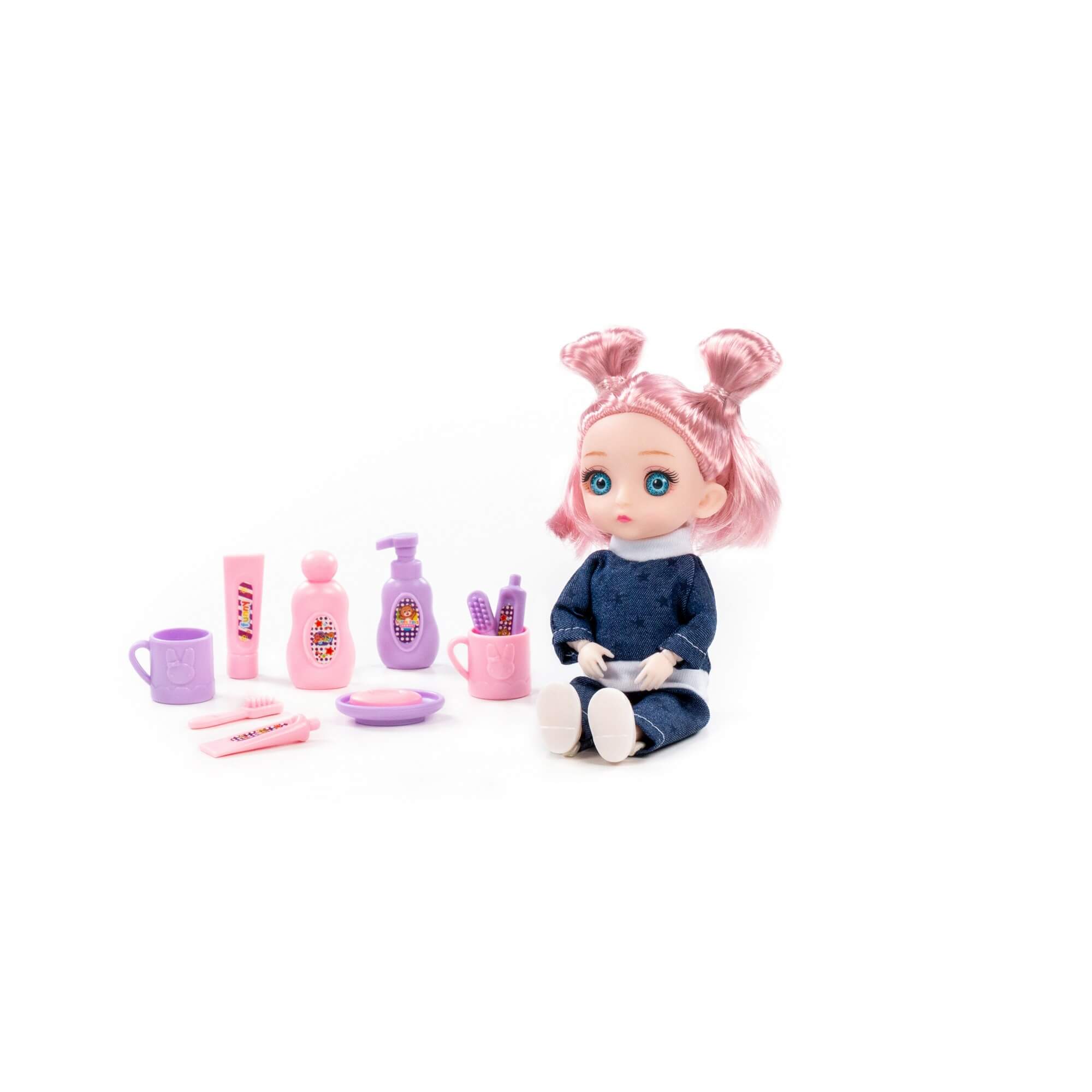 В наборе с куклой идут игрушечные средства личной гигиены: шампунь, гель для душа, мыло с подставкой, крем, две кружки, щетки и пасты для чистки зубов. Игрушечные баночки дают ребенку базовое представление о необходимости ухода за собой, а также правилах личной гигиены. Благодаря наличию тематических аксессуаров ребенок может придумать множество необычных и интересных сценариев игры.
