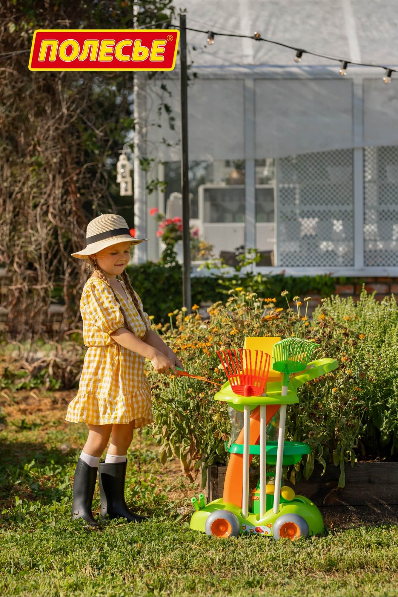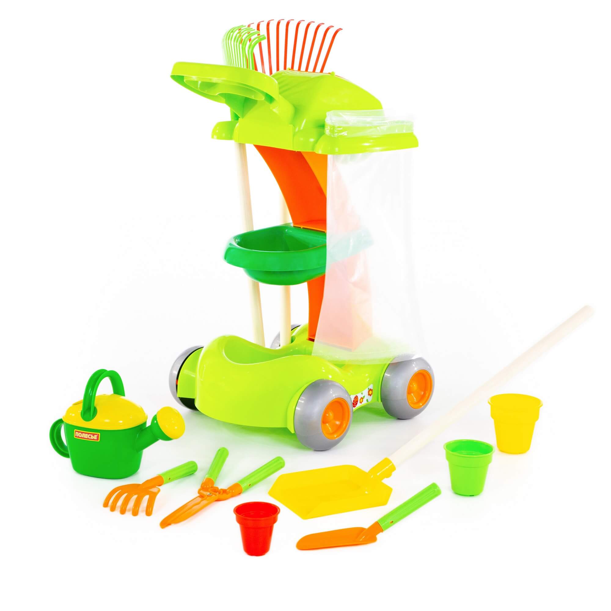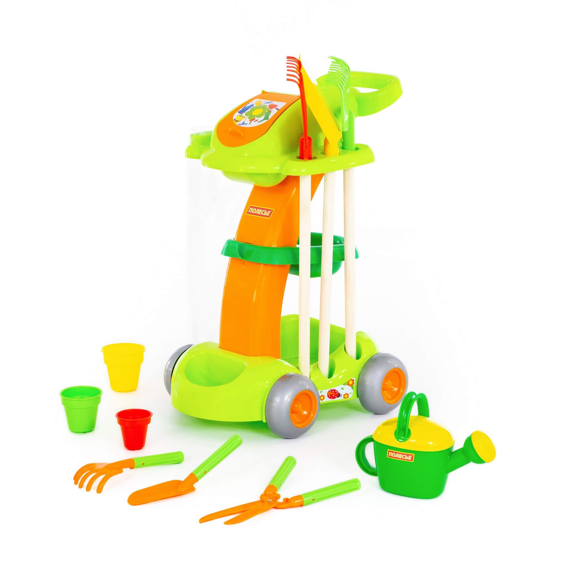 Набор выполнен в виде тележки, которую легко перемещать. В игрушечный садовый набор входят: