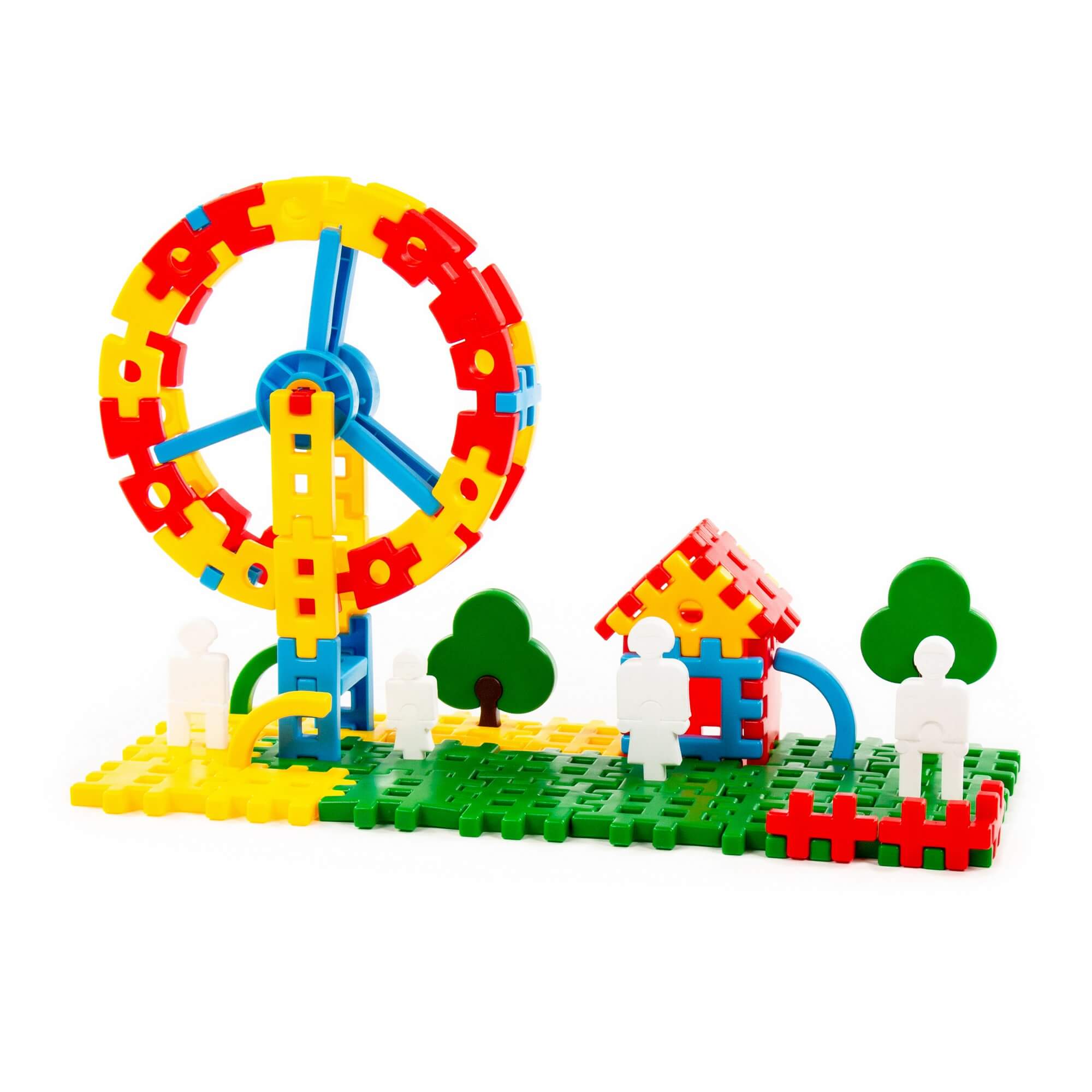 Детский конструктор «Луна-парк 1» - сюжетный конструктор от фабрики Полесье, который помогает ребёнку раскрыть творческие способности. Он состоит из ярких деталей разных форм и размеров. Из «строительного материала» для Луна-парка можно собрать домик, колесо обозрения, арочные ворота, качели и трамплин. Также в конструкторе для детей имеются фигурки человечков и растений.