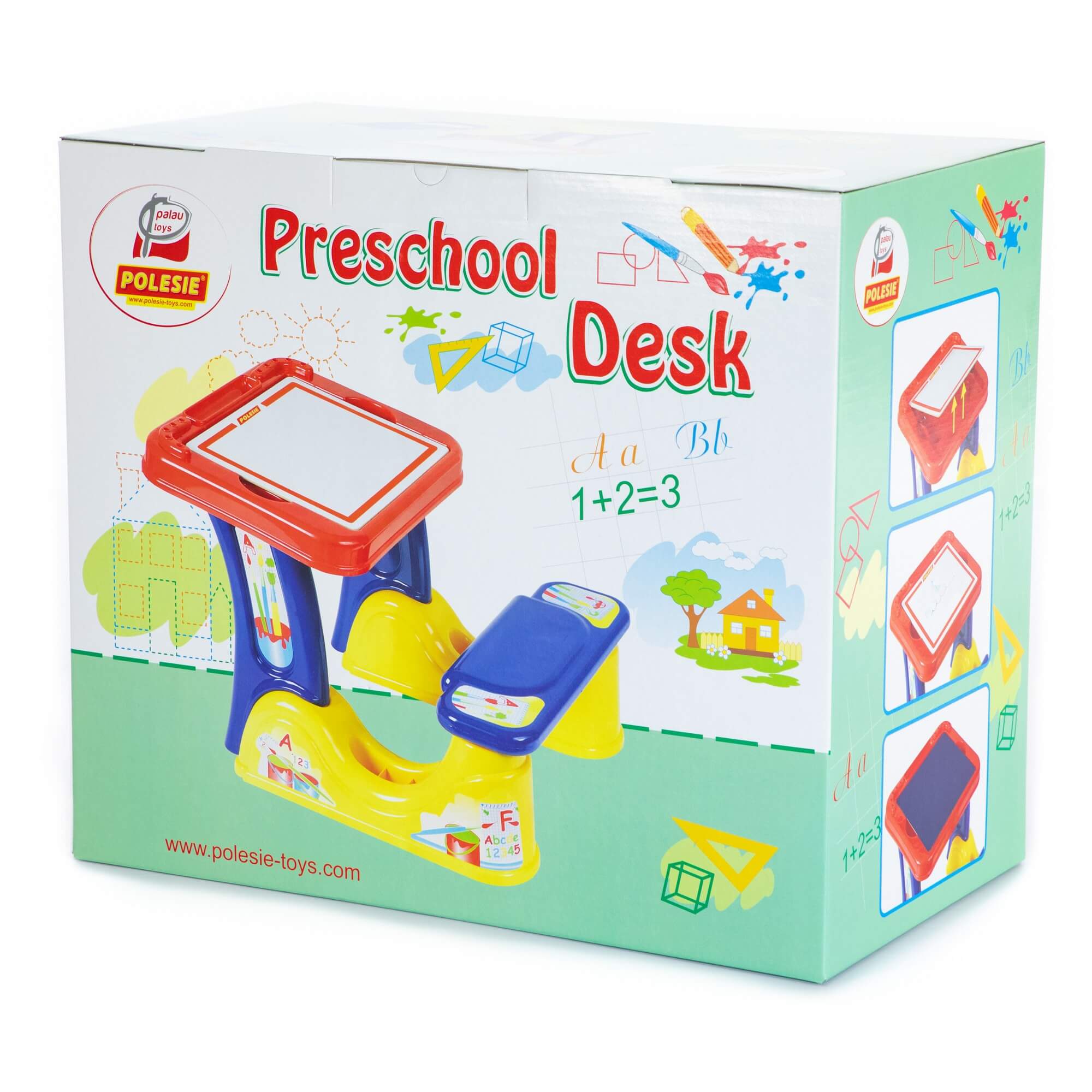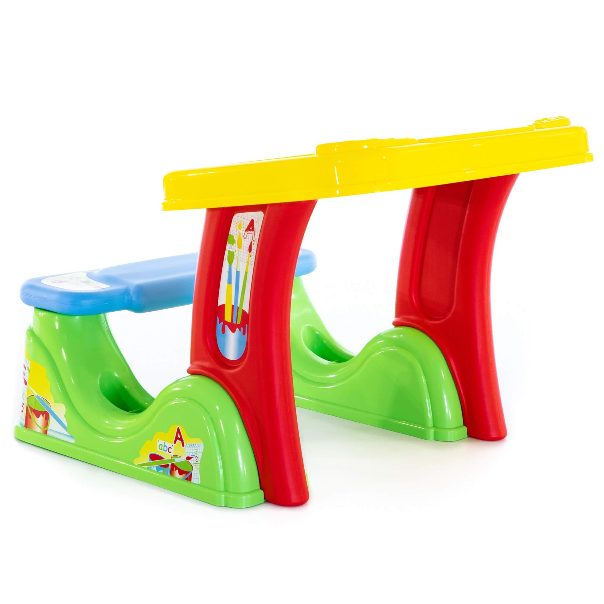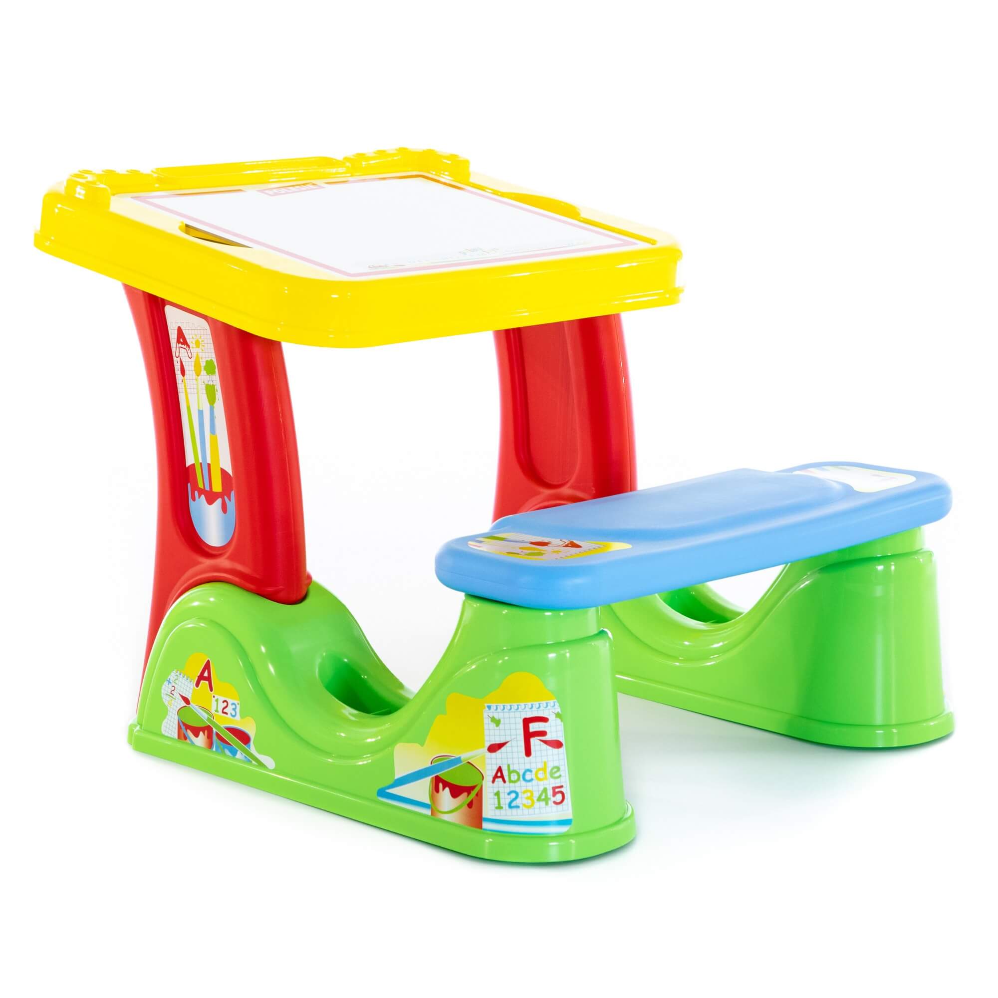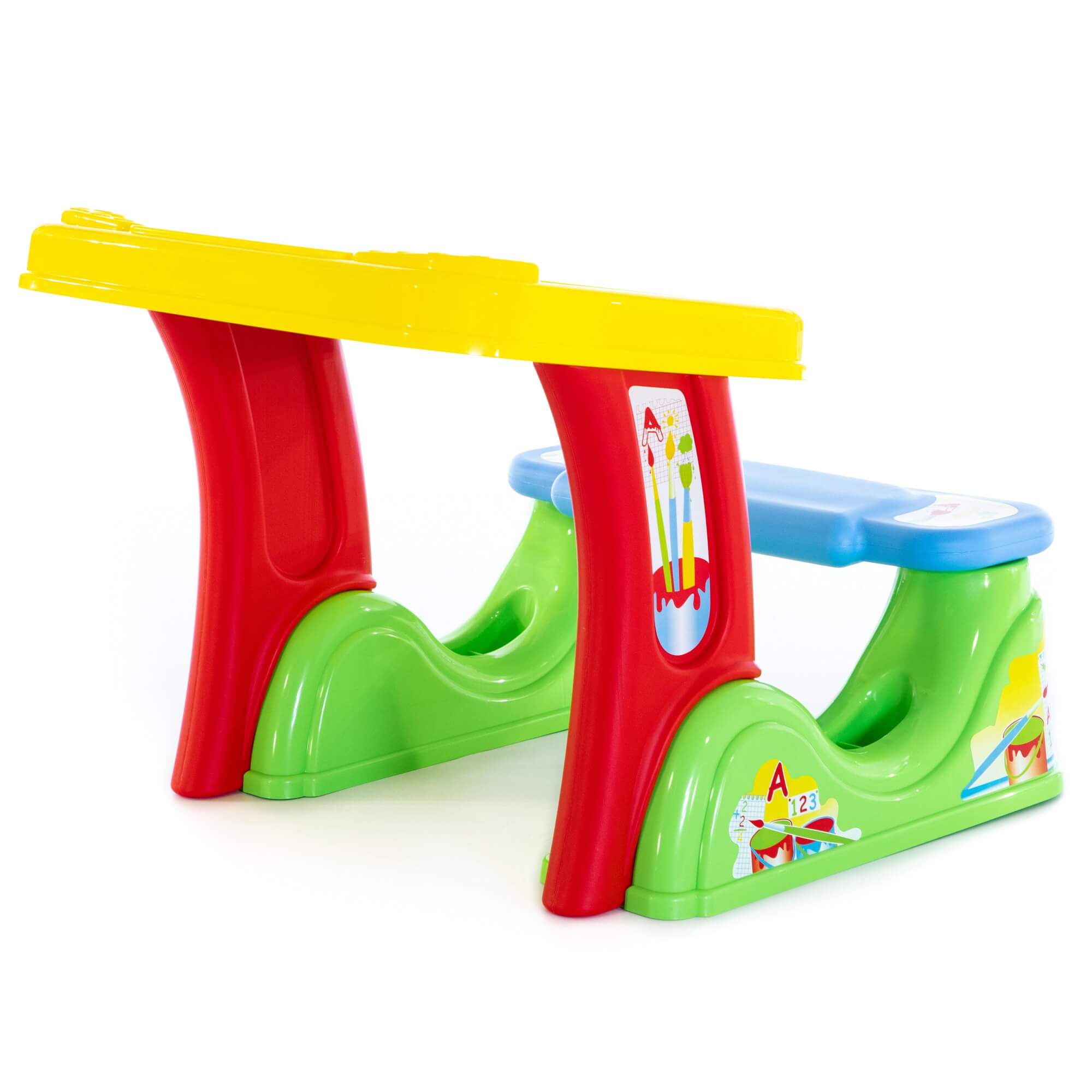 Парта соединена со скамейкой. Поверхность стола – съемная пластиковая панель, под которой находится органайзер для канцелярских принадлежностей. С одной стороны панели можно писать стирающимся маркером, с другой - мелками.