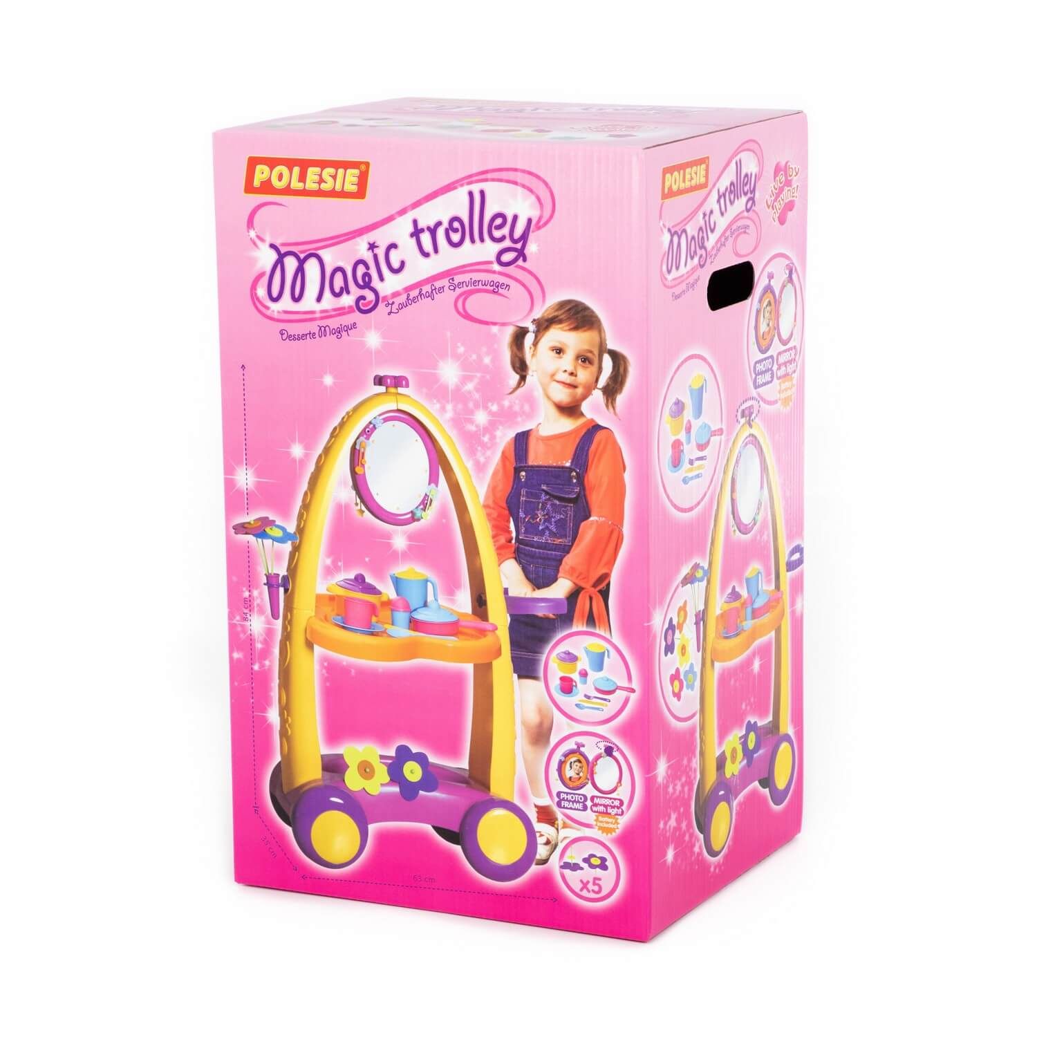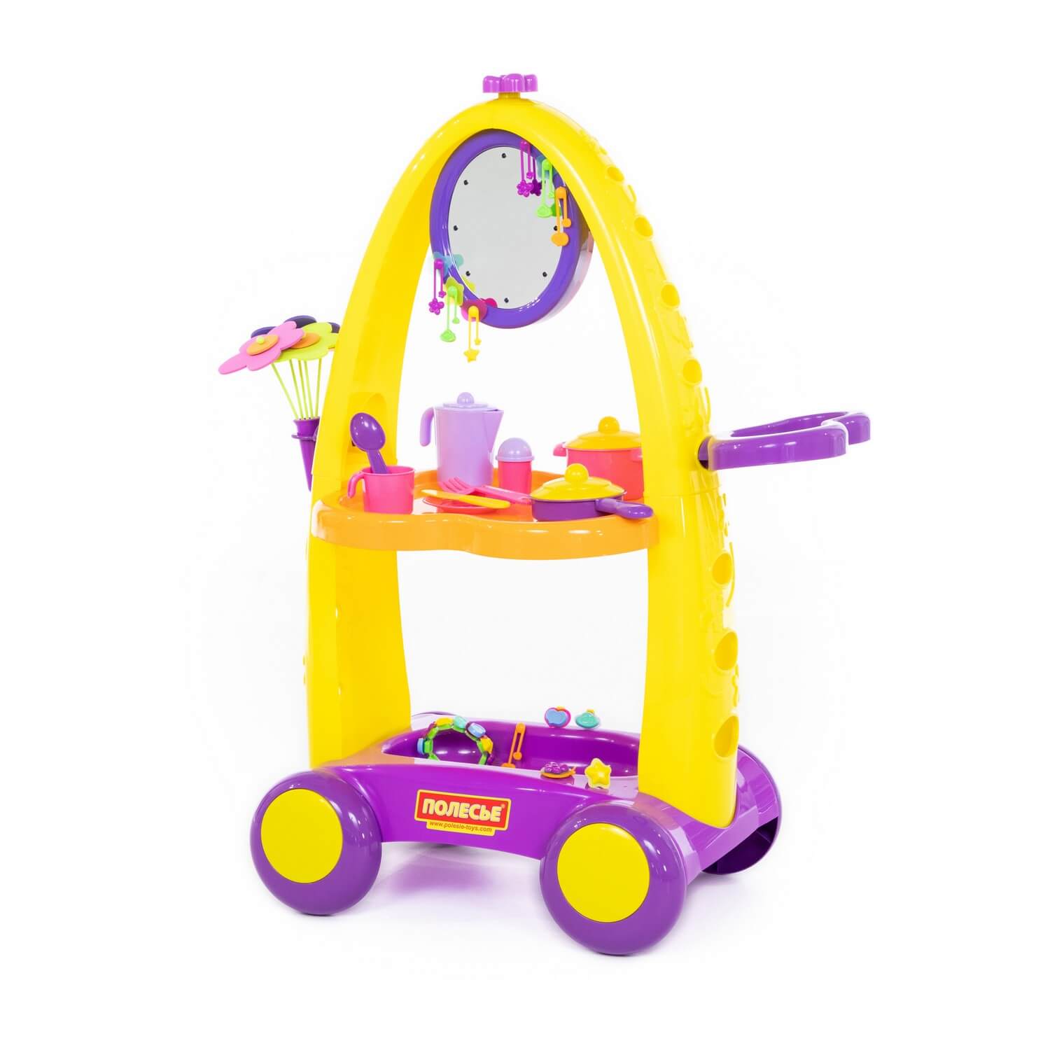 Игровой комплекс представляет собой тележку, которая может выполнять роль как туалетного, так и сервировочного столика, ведь комплекс оснащен зеркальцем с подсветкой, набором украшений, а также набором посудки. Кроме того, можно собрать и поставить в вазочку 5 цветочков.