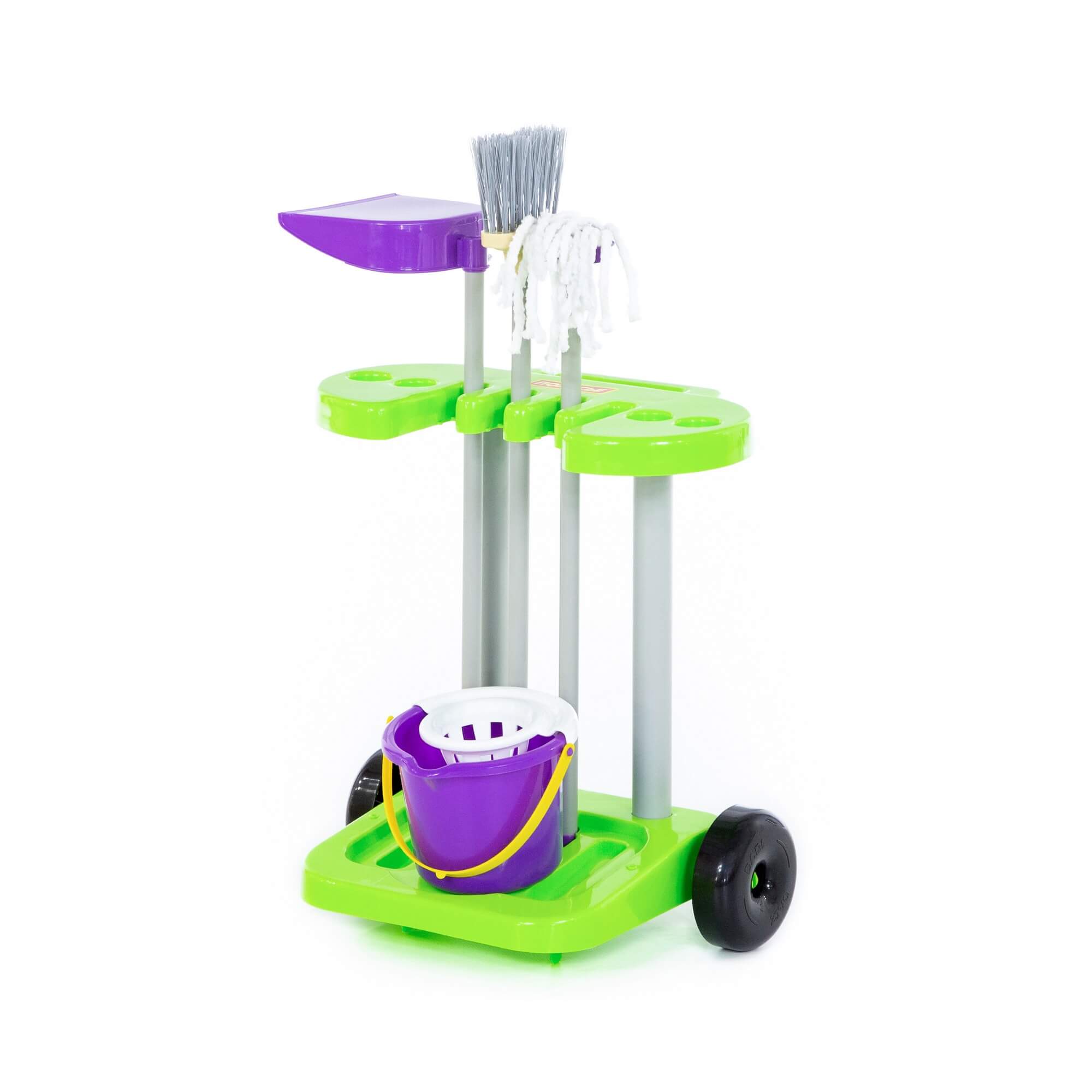 В наборе на тележке ведерко с отжимом, швабра, щетка и совок.