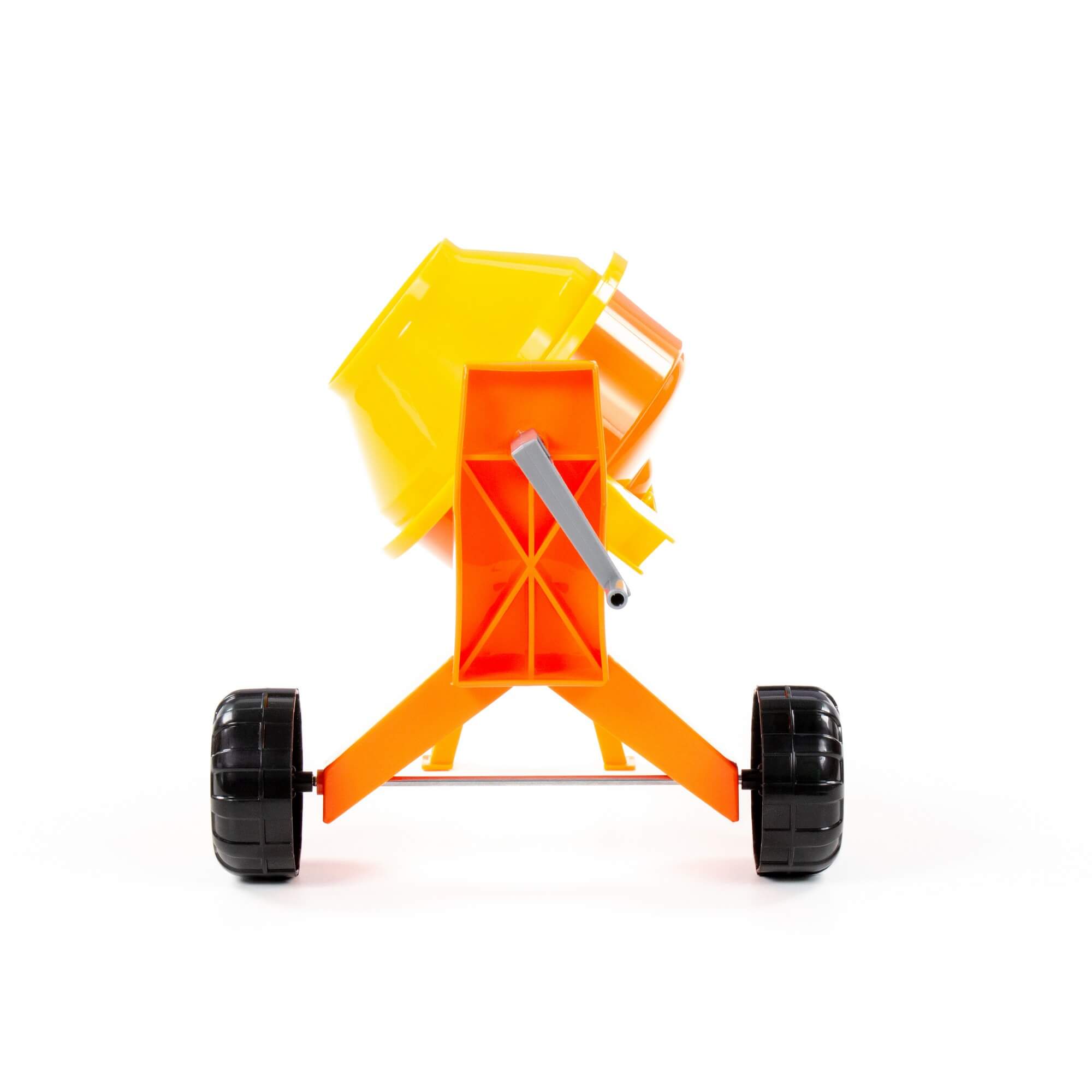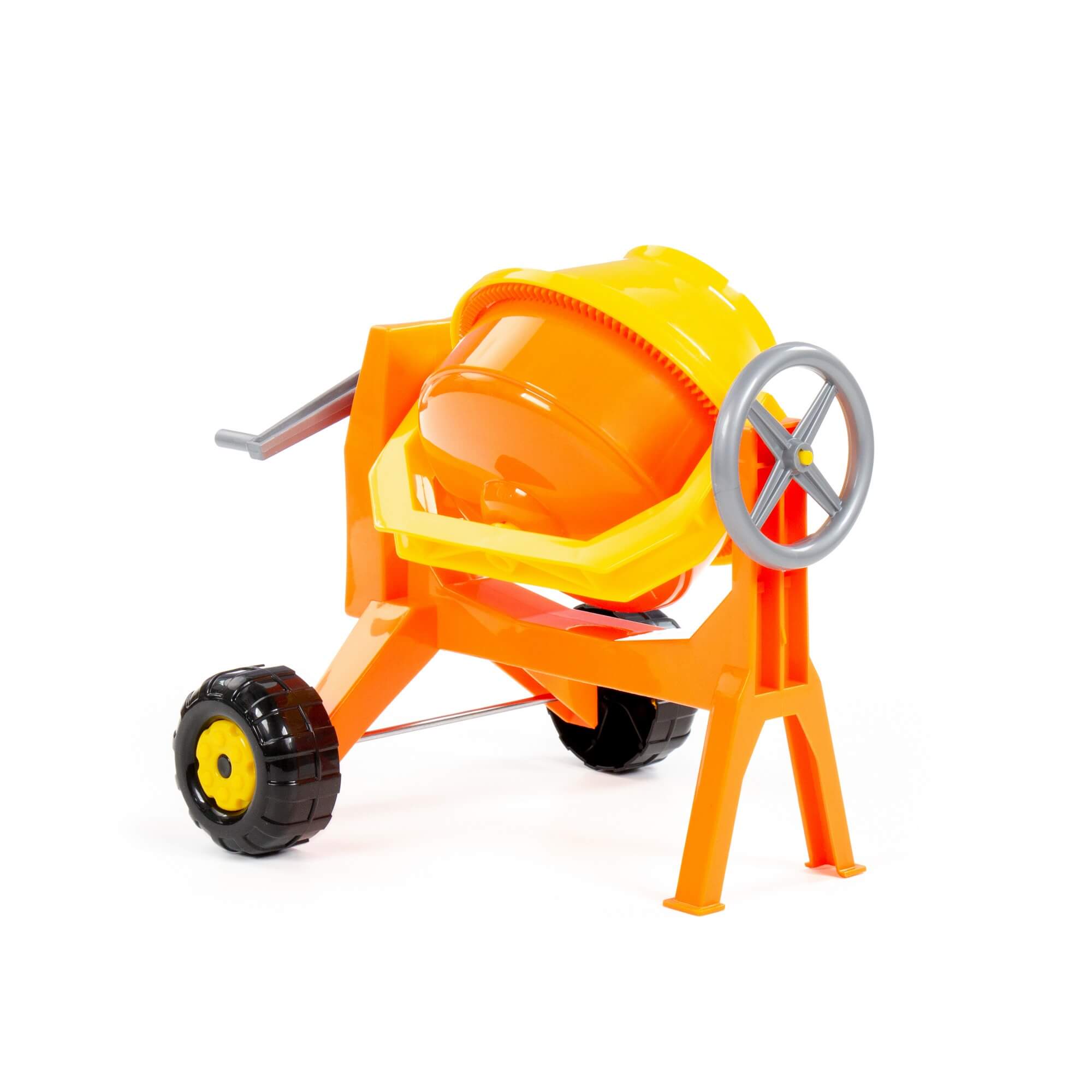 Бетономешалка максимально схожа со своим реальным аналогом. Она имеет смесительный барабан, который приводится в движение вращением ручки, опрокидывающий механизм с разными положениями фиксации и удобные колёса для перемещения.
