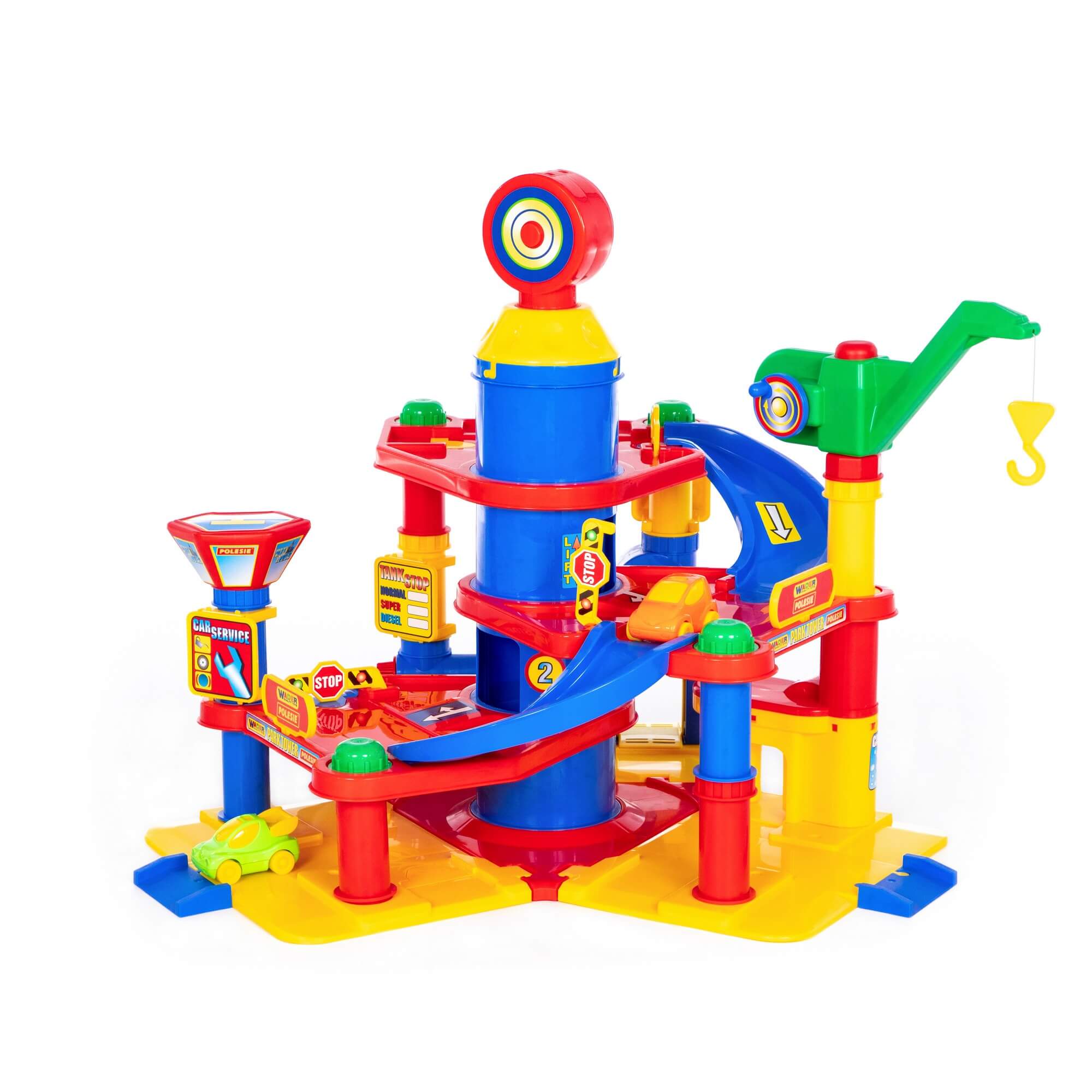 Паркинг для детей представляет собой четырехуровневую парковку. На парковку игрушечные автомобили можно поднимать на лифте, а спускать по съездам. Машинки (2шт.), входящие в набор, можно обслужить в игрушечном автосервисе: проверить автомобиль на подъёмнике, "помыть" на автомойке, заправить на АЗС, выбрав подходящее топливо. Лифт, мойка и эстакада приводятся в движение при вращении установленных рукояток так же, как и подъемный кран.