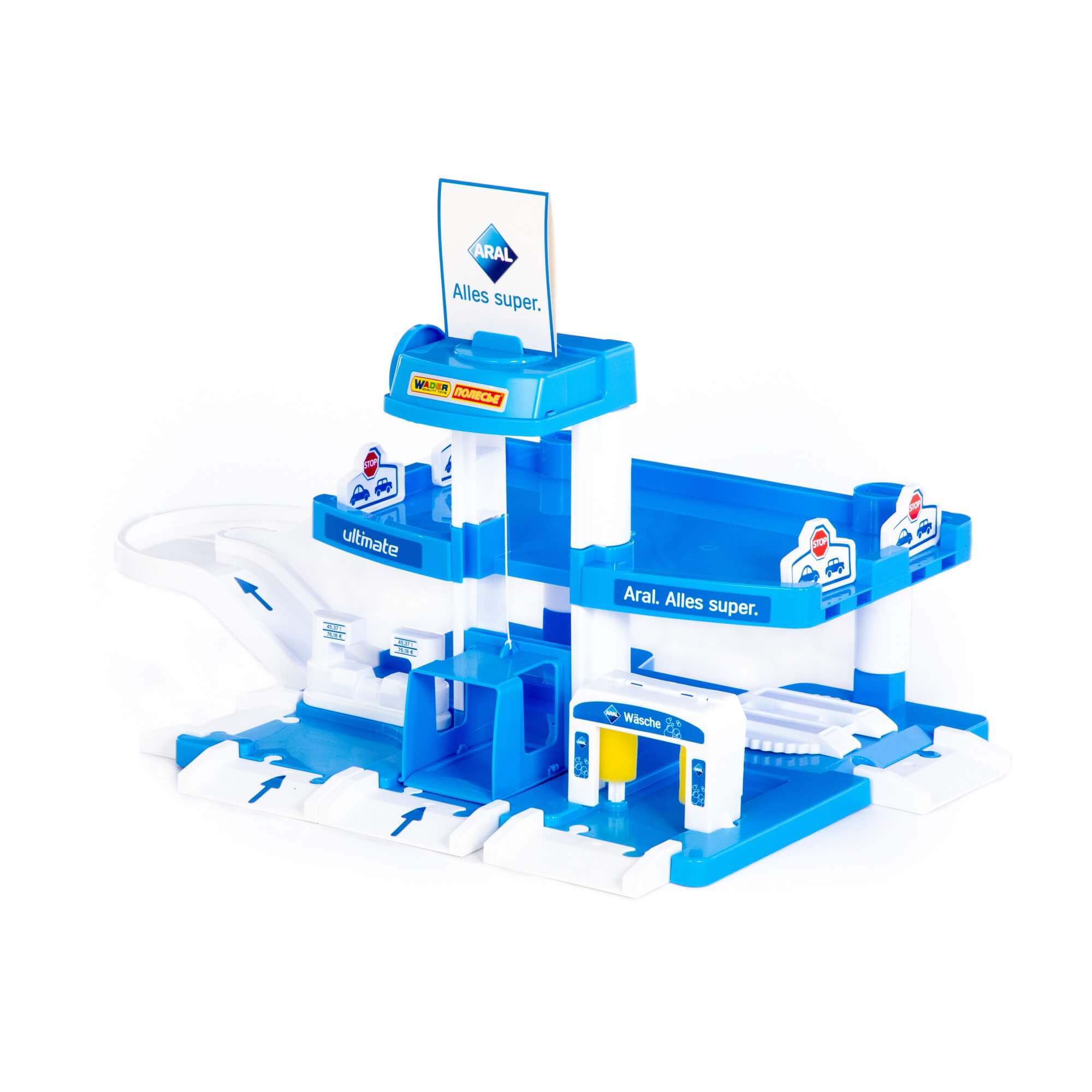 Компактный паркинг в два уровня. На первом уровне паркинга расположены автомойка, автозаправка, эстакада. Для подъема на второй уровень установлен лифт, который приводится в движение с помощью рукоятки на верхнем уровне. Автомобили в набор не входят.