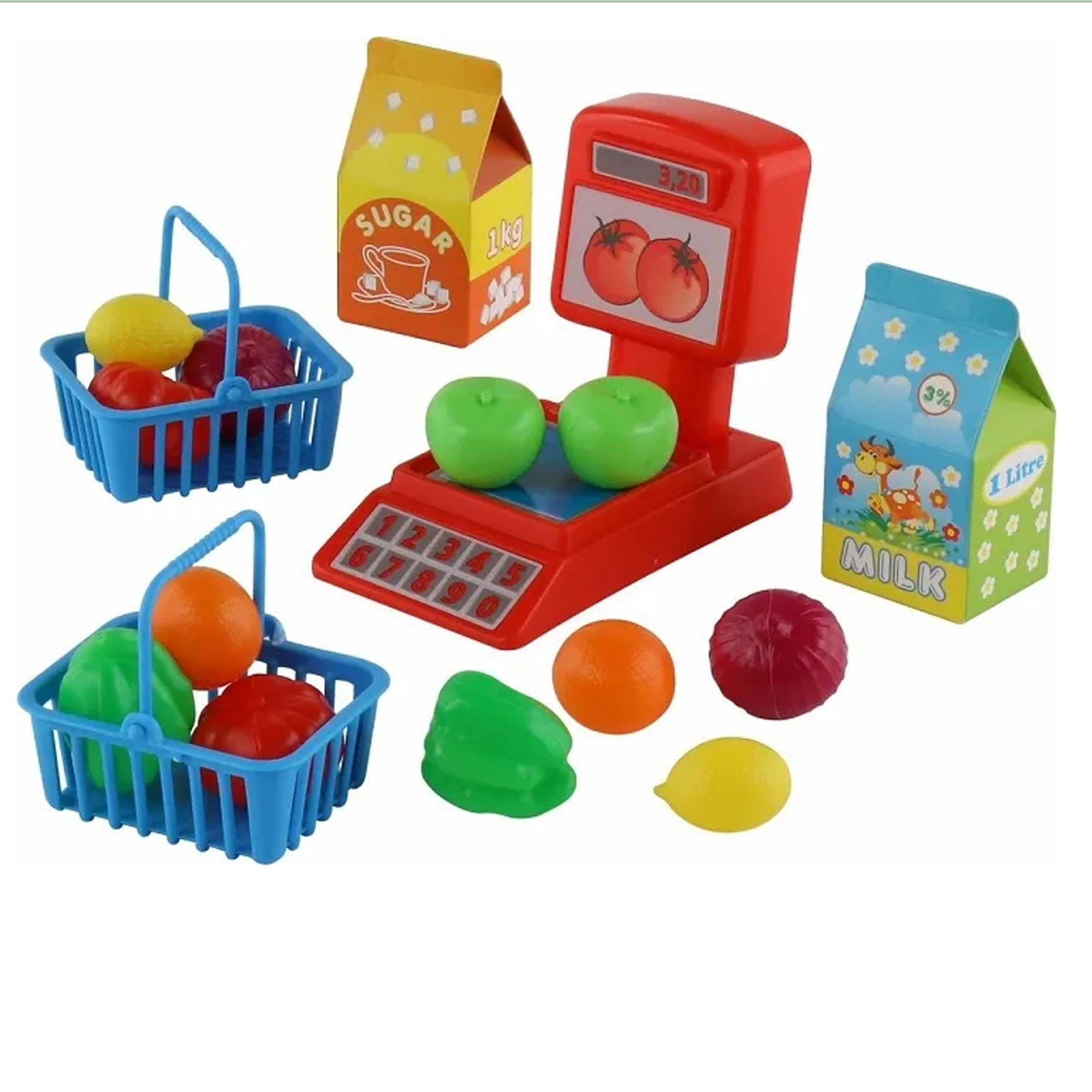 Детский игровой набор мини "Супермаркет" от фабрики Полесье представляет собой маленький прилавок и витрину, где продаются игрушечные фрукты и овощи: