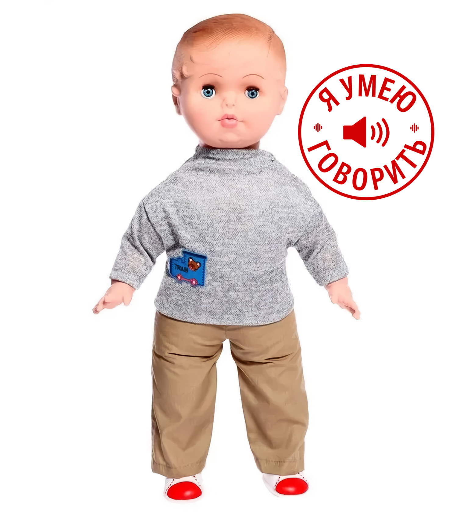 Андрюша - кукла-мальчик с правильными пропорциями тела и милым личиком. У Андрюши вставные закрывающиеся глаза. Его можно укладывать спать.Парик рельефный. Туловище изготовлено из мягконабивного материала, голова, ручки и ножки из пластиката ПВХ. Кукла озвучена приятным детским голосом, она произносит более 6 фраз: "Привет! Давай дружить! Давай поиграем! Ты знаешь интересную сказку? Расскажи мне! Молодец! Мне очень понравилось! Я тебя люблю! ". В комплект одежды входит: свитер, брючки, ботиночки.