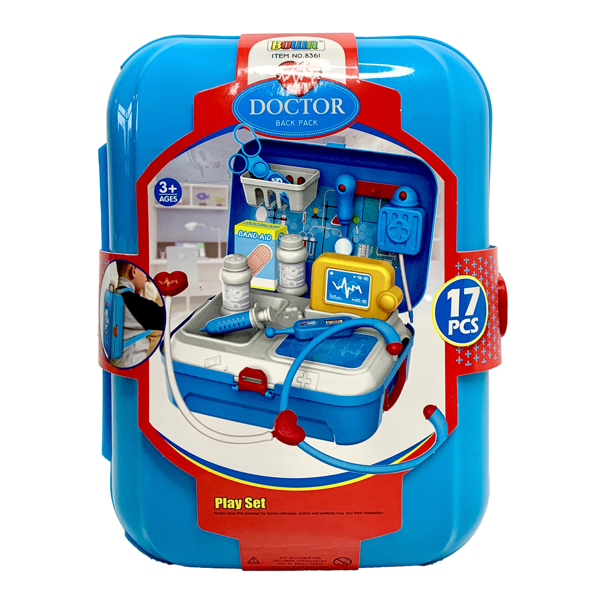 В наборе имеется 17 предметов для игры в доктора. Размер медицинских принадлежностей для детей: 5-10 см. Все детали находятся внутри пластмассового чемодана, который можно использовать как рюкзак, для этого имеется специальные ремни.