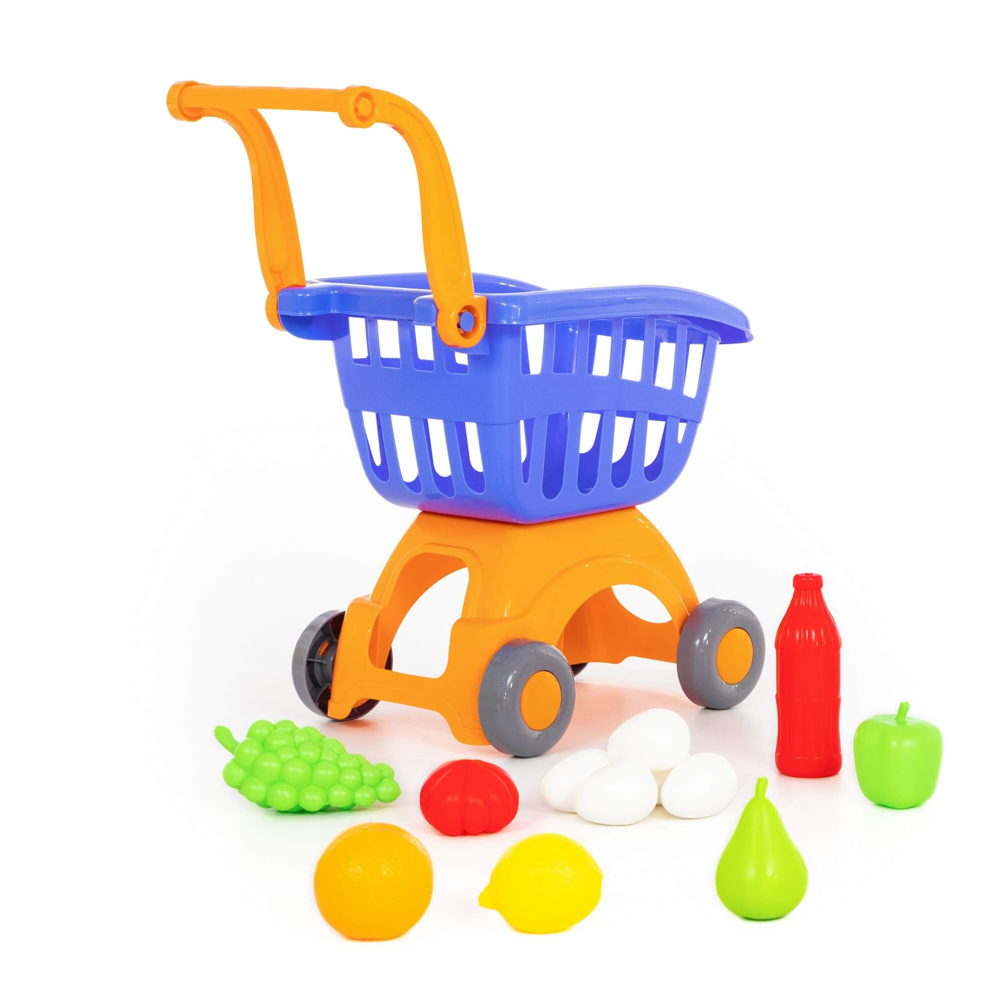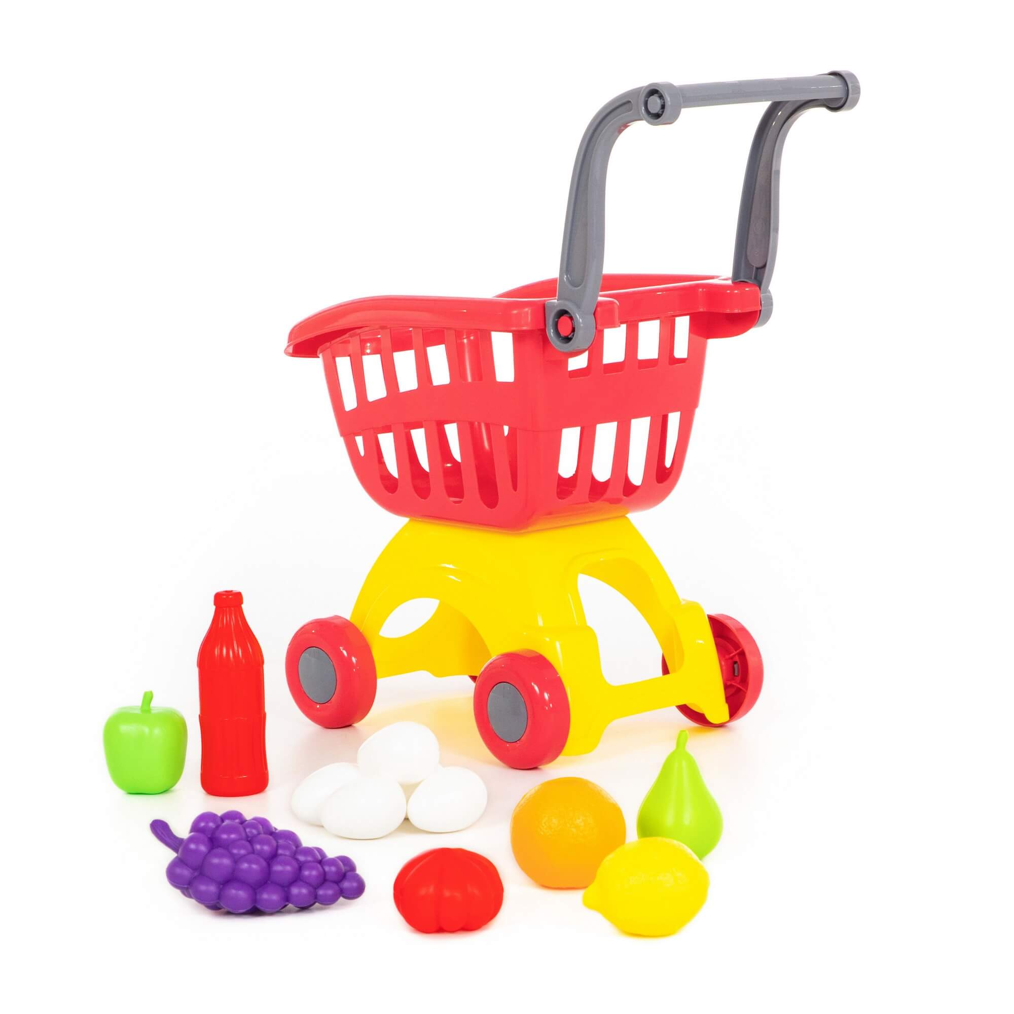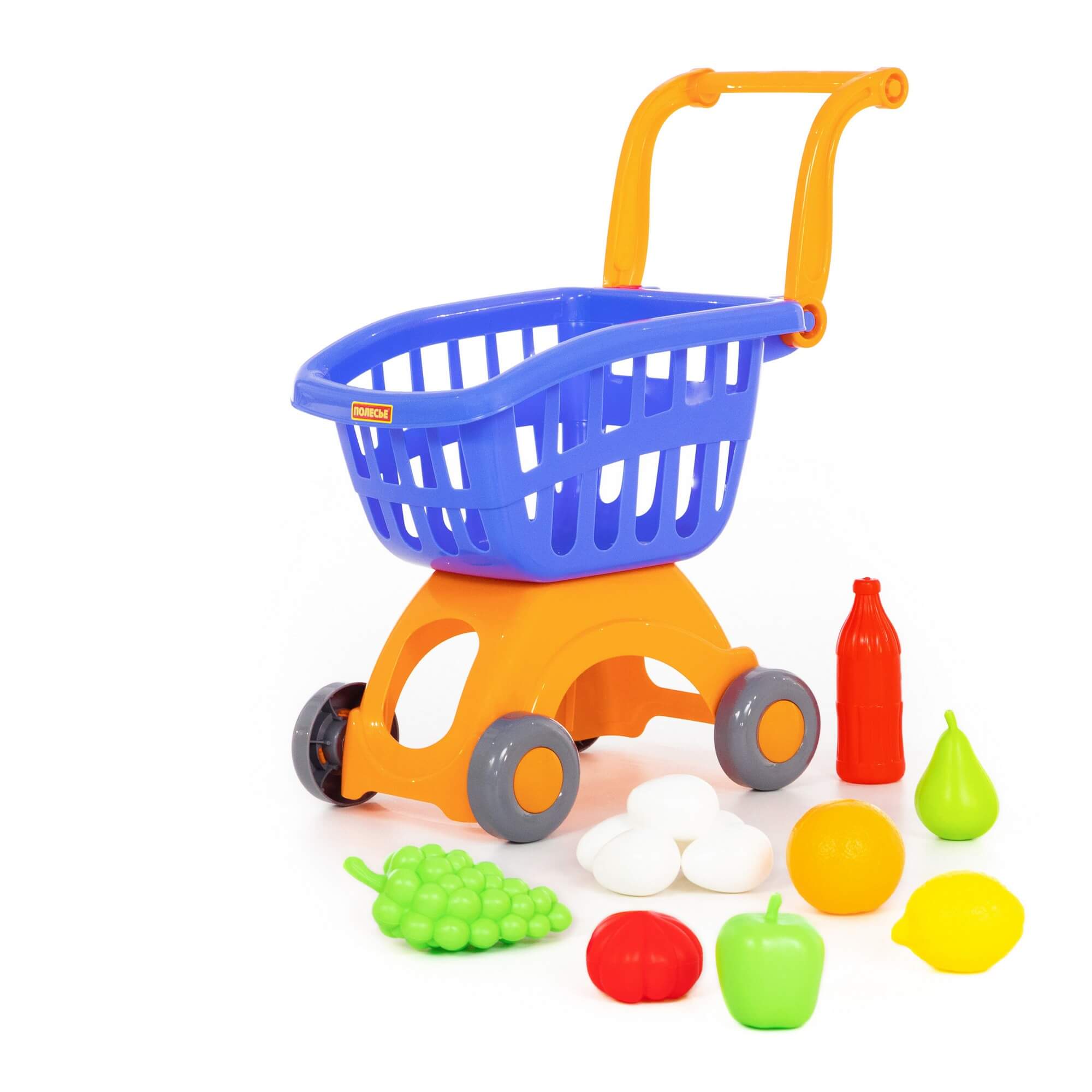 В комплект игрушечной тележки входит набор продуктов для детей: