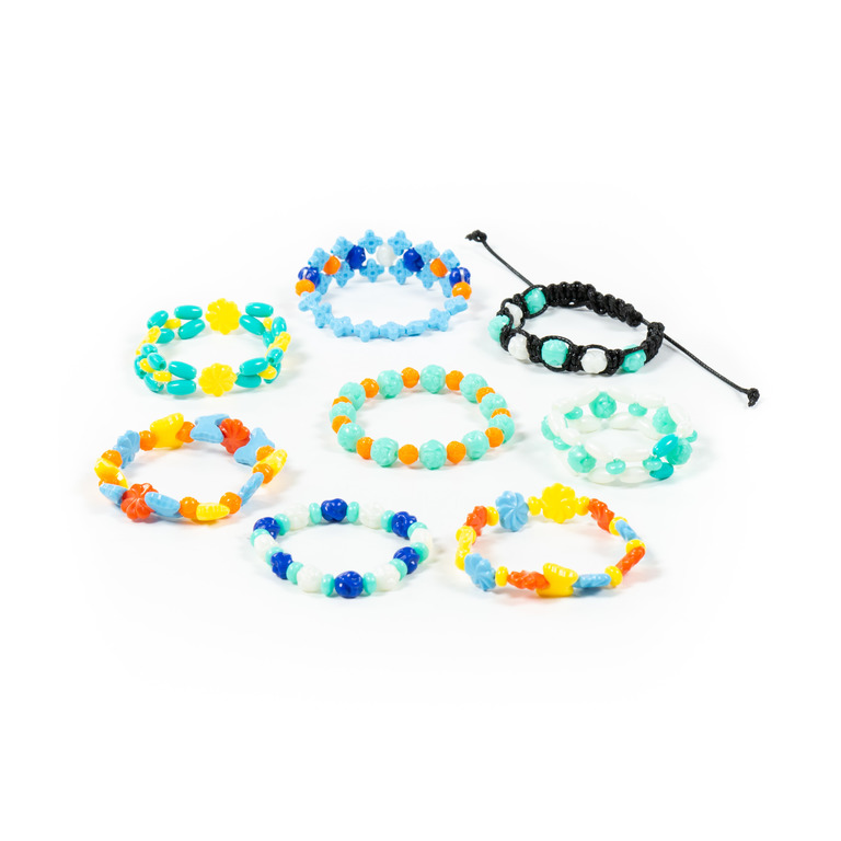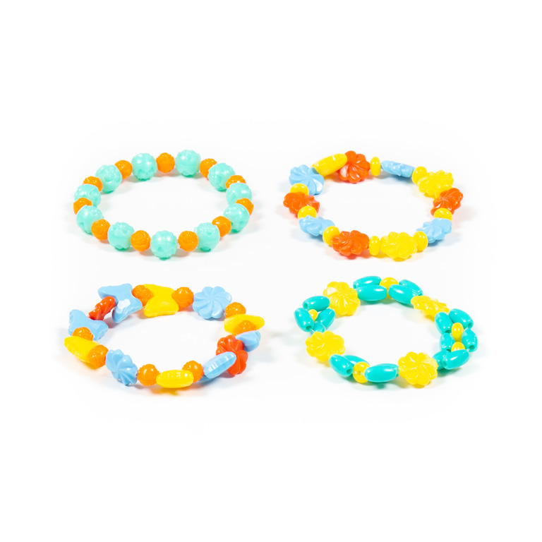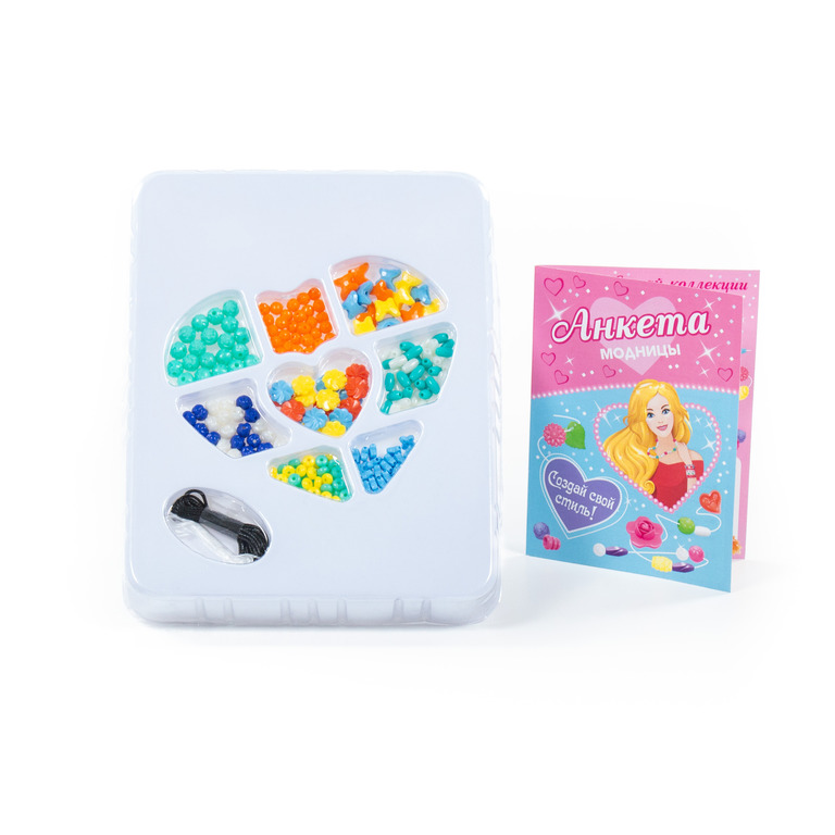 В комплект входит более 200 бусинок, шнурок и резиночка для украшений. Все бусины имеют разную форму и цвет, выполнены из качественного пластика. Разнообразит игру и сделает её ещё интереснее анкета модницы, которая также входит в комплект. Такой набор для плетения позволяет фантазировать, творить, создавать своими руками разнообразные браслеты, фенечки и играть в салон красоты.