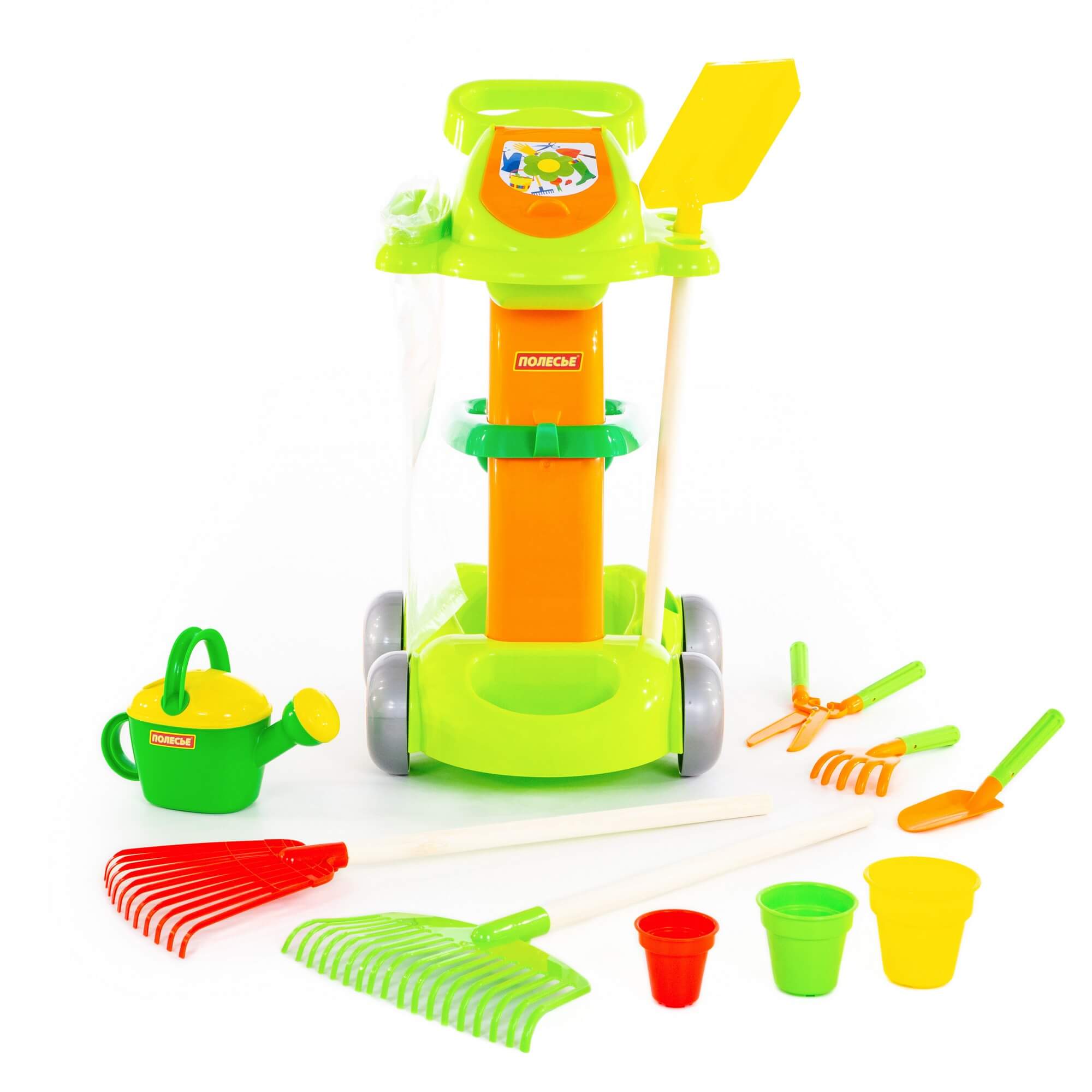 Набор выполнен в виде тележки, которую легко перемещать. В игрушечный садовый набор входят: