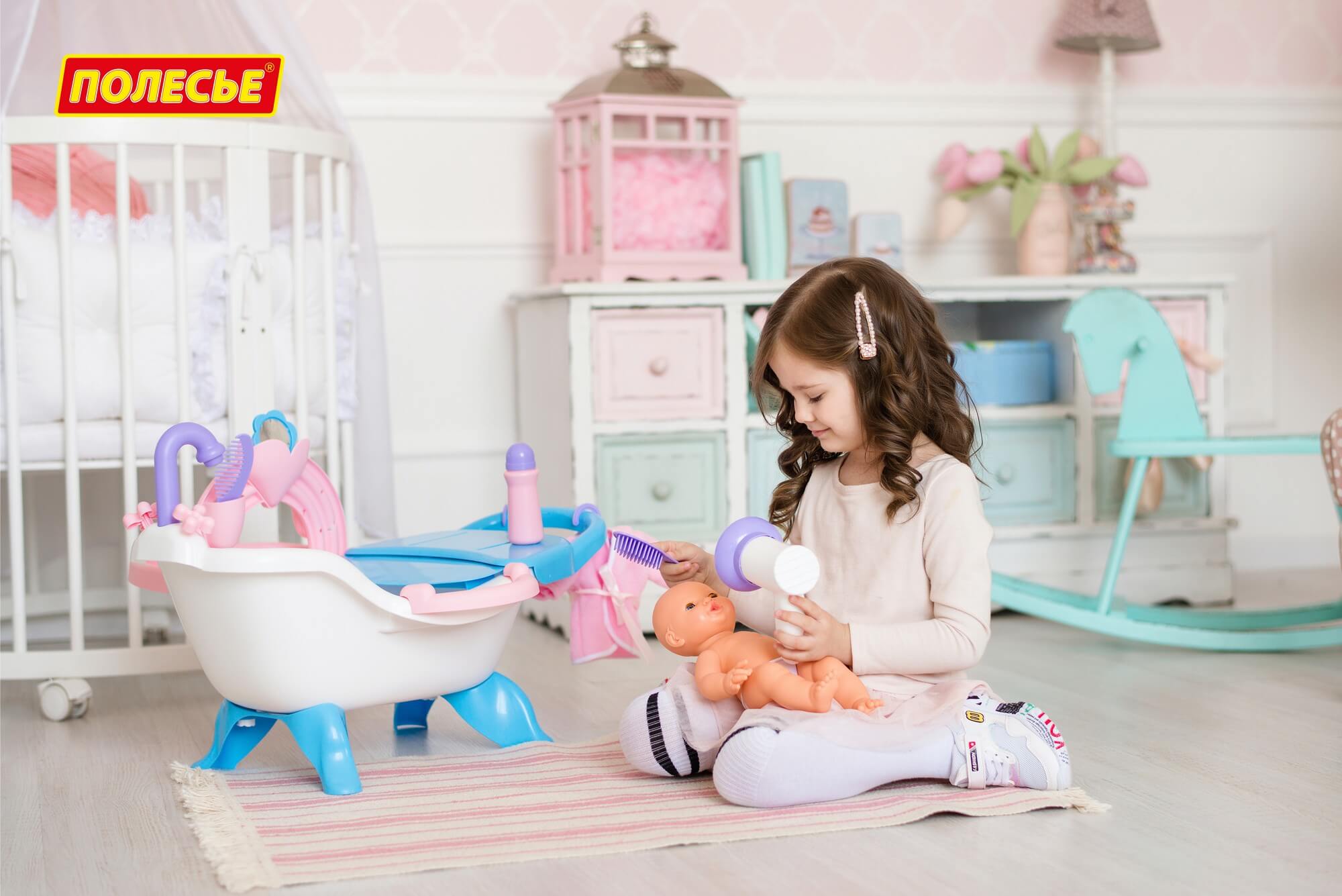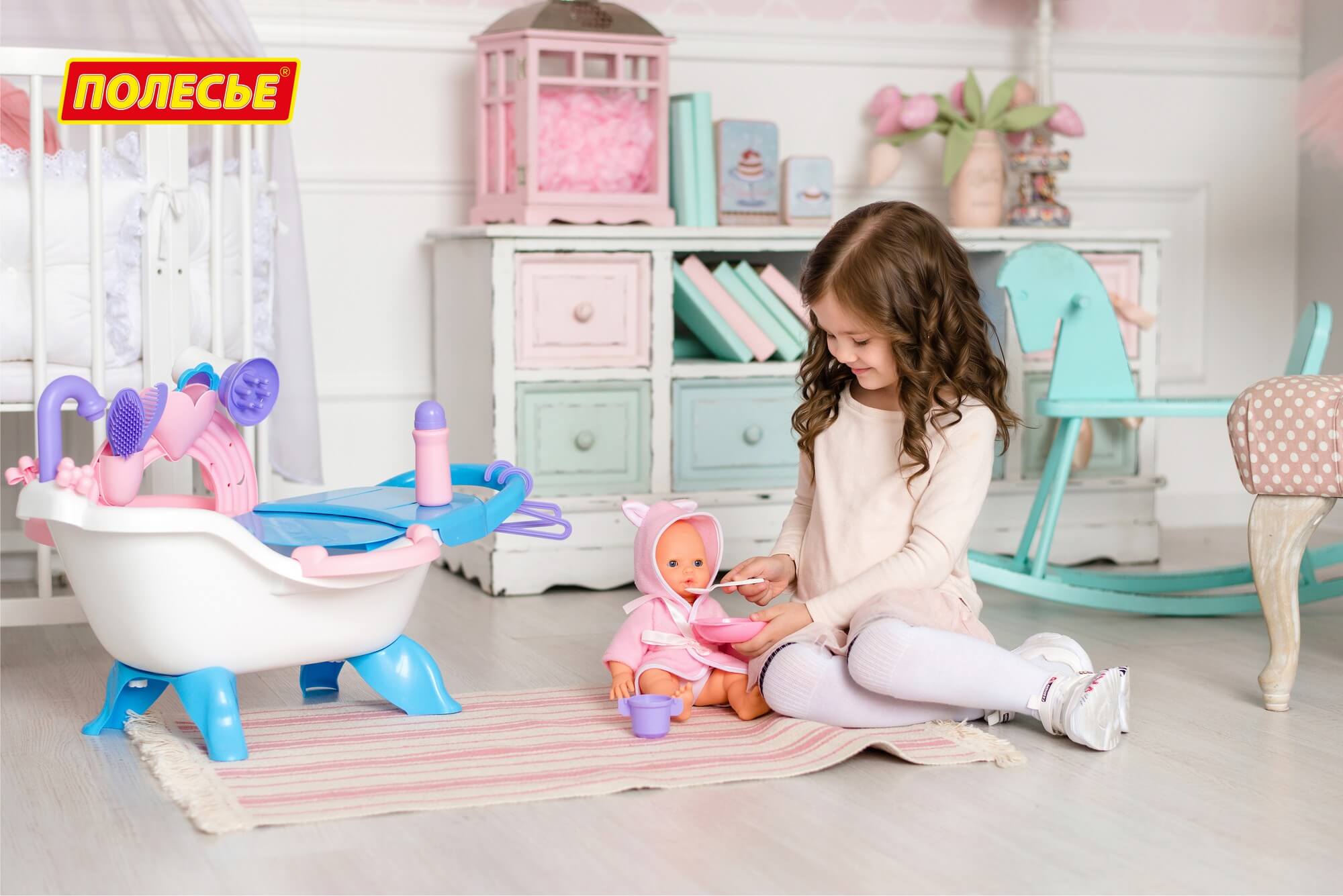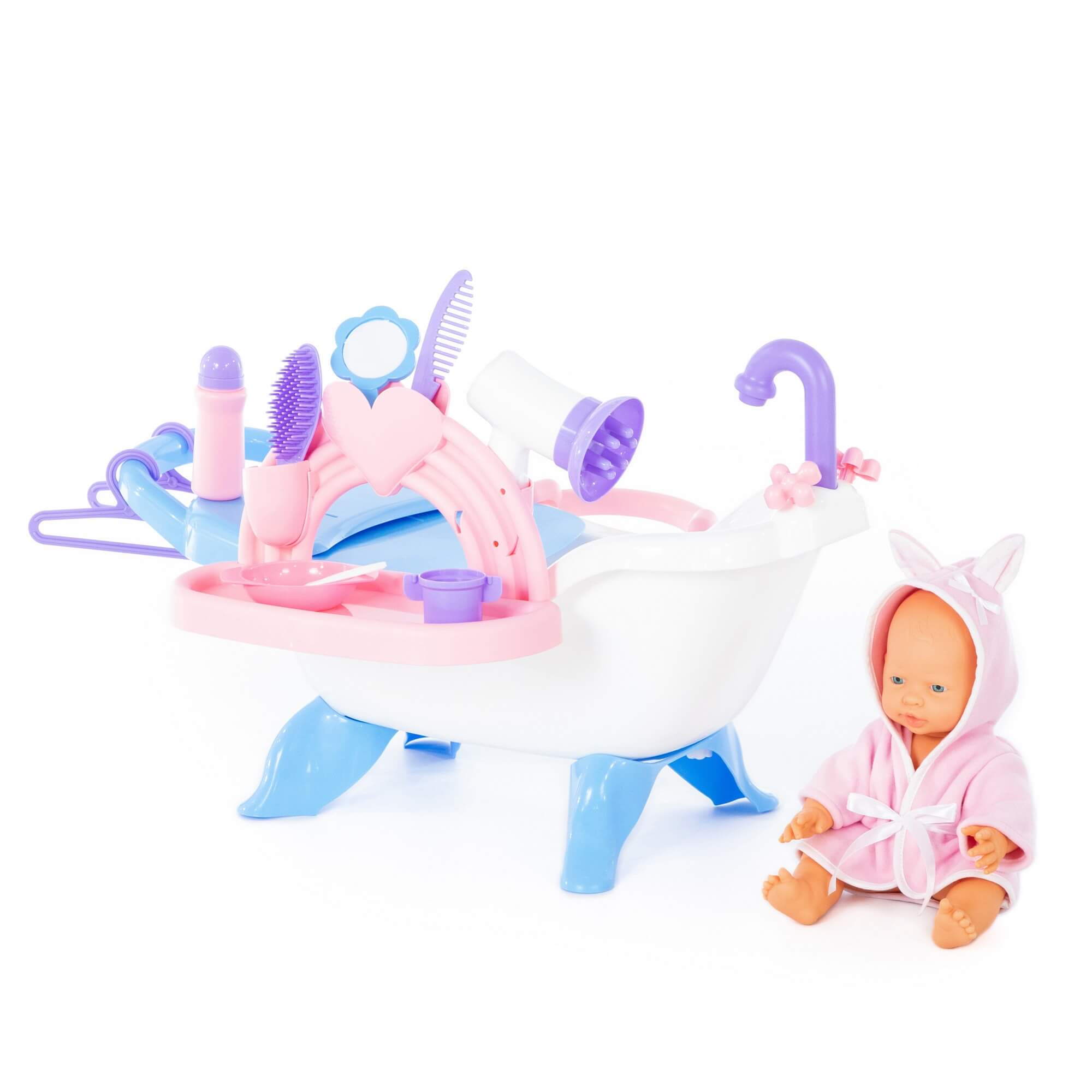 Набор представляет собой ванну на 4 ножках для кукол с пеленальным столиком. В набор входит пупс длиной 33 см. Куклу можно не только искупать, но и причесать и накормить. К ванне крепится пеленальный столик с выдвижной полочкой, карманчики для игрушечных детских принадлежностей. Такой набор станет прекрасным подарком для ребенка, ведь с ним можно играть дома, использовать в качестве игрушки для купания, а также это отличная игрушка для улицы и для дачи.