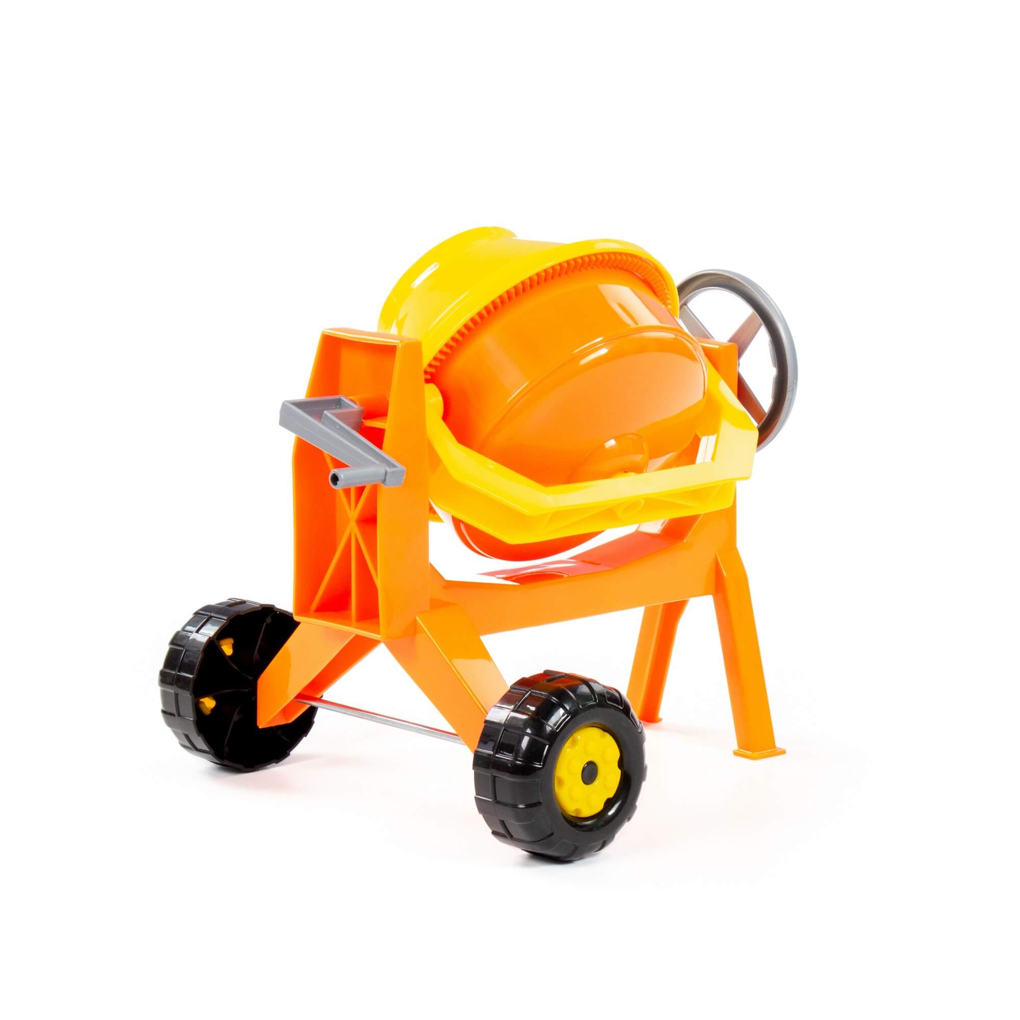 Бетономешалка максимально схожа со своим реальным аналогом. Она имеет смесительный барабан, который приводится в движение вращением ручки, опрокидывающий механизм с разными положениями фиксации и удобные колёса для перемещения.